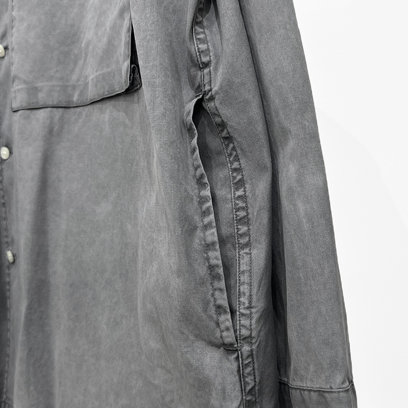 VAINL ARCHIVE(ヴァイナルアーカイブ)のGRAB-SH(VAS24S002)です。製品染めを施したワークシャツです。通常ドレスシャツに使用されるピンオックスフォードの細番手糸を採用しています。美しい色ののりと、ベタッとしたムラが生じにくい仕上がりを実現し、大胆な加工でありながらも上品な印象を与えます。