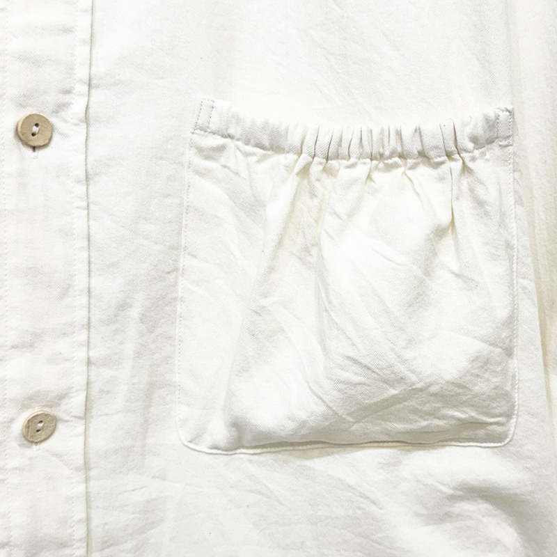 refomed(リフォメッド)のWRIST PATCH WIDE SHIRT "CHAMBRAY"(RESH-012)です。現場作業で腕の内側に擦れや汚れが付きやすいことから着想を得たリストパッチが特徴的なシャツです。ガーゼのようなふんわりとした肌触りのコットンシャンブレー素材を使用し、製品洗いを施すことで、より膨らみのある風合いに仕上げています。肩を落としたワイドシルエットで、背中に取られた4タックがよりボリューム感を演出します。アームホールも広めに設計されており、スウェットやニットの上からでも着用可能です。