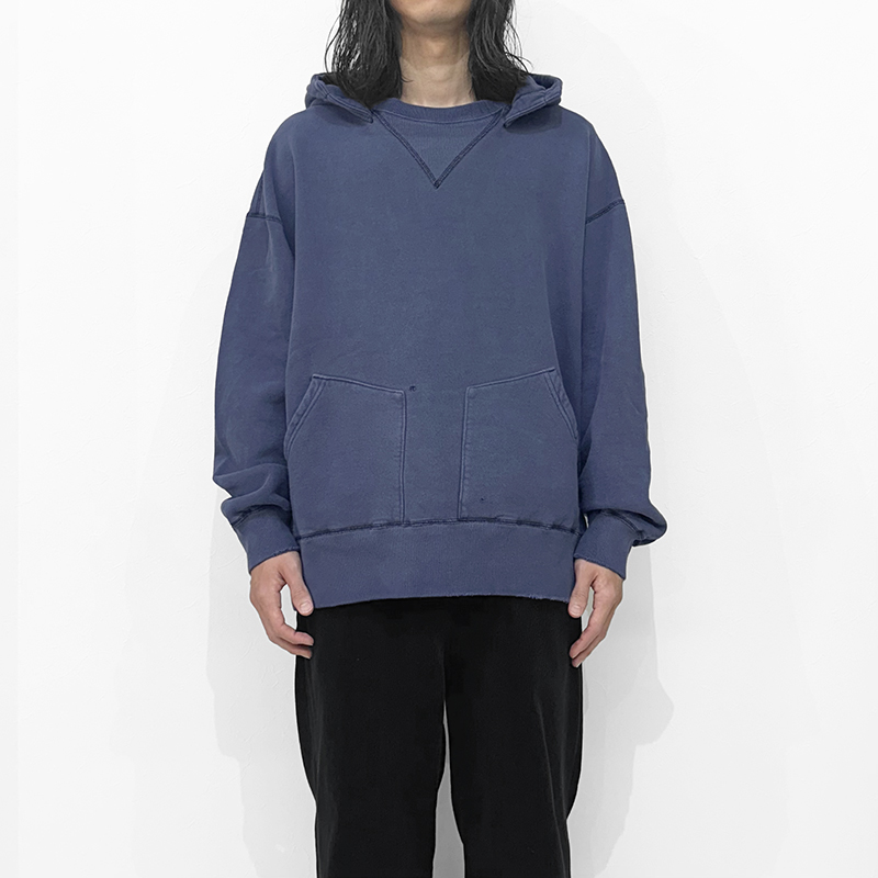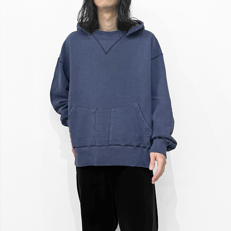 URU(ウル)のSWEAT PARKA(24FUC08)です。フードが後付けされたデザインのスウェットパーカーです。無色の生地に顔料染めを施すことで色褪せた風合いを表現し、バイオ加工で柔らかさを引き出しています。顔料染めは、生地の表面に顔料を定着させる染色方法で、洗いをかけるごとに少しずつ風合いが変化し、さらにヴィンテージ感が増していきます。裾と袖口にはダメージ加工を施しており、裏起毛はつぶれたような質感で、長く着込んだかのような仕上がりです。