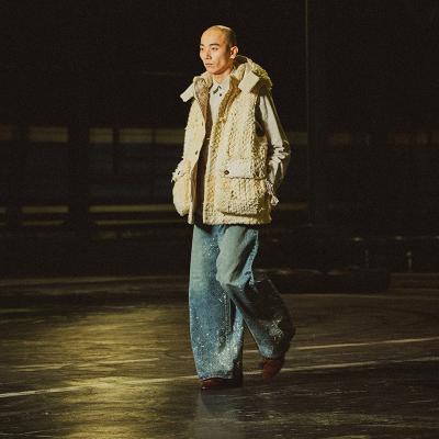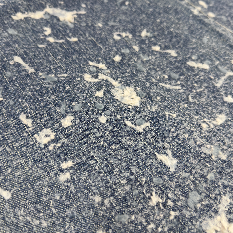 SUGARHILL(シュガーヒル)のMOLDED DENIM TROUSERS WIDE CUT(2411300414)です。現代的な日常に馴染むバギースタイルのデニムパンツです。ヒップから裾にかけてゆとりのあるシルエットで、裾を折り返して穿くことを前提として設計されています。岡山のクロキ株式会社と共同開発した12.8oz左綾デニム「JIMI CLOTH」を使用し、フェード加工を施した上にフロッキー加工を加えることで、カビが生えたようなヴィンテージデニムを再現しています。左綾デニム特有の縦落ちが生み出す立体感が特徴で、ピュアインディゴ染めの縦糸とライトベージュの緯糸が絶妙に調和し、奥行きのある色合いを演出しています。鉄製のネオバボタンには錆びたような風合いを持たせ、銅製リベットは経年変化を再現した緑青の深みある色合いに仕上げています。ブランドロゴが刻まれた牛革製の皮パッチ、引き手部分にエンブレムの太陽のマークが刻印されたオリジナルファスナーを採用しています。