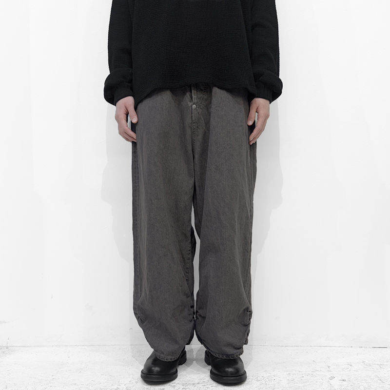 refomed(リフォメッド)のFRESH MAN DENIM WIDE PANTS "OD"(REPT-032O)です。裾のギャザーが特徴的なワイドデニムパンツです。職人たちがシルエットで個性を表現してきた文化に着想を得て、「超超ワイド」や「5超」などの極太スタイルをベースにシルエットを調整。裾にはゴムギャザーを施し、着用時に自然なクッションが生まれるよう設計されています。素材には11.5ozのスラブデニムを使用し、ヴィンテージデニムを彷彿とさせる独特の表情を演出。ベルトループとして機能するレザーパッチや、時間とともに味わい深く変化する鉄製ボタンなど、経年変化を楽しめるディテールも魅力です。