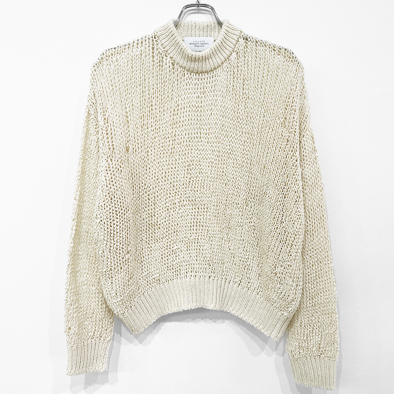 UNUSED(アンユーズド)のCotton pullover knit(US2510)です。ランダムな編み目が特徴のメッシュニットです。編み目の大きさに変化をつけることで、奥行きのある表情に仕上げています。素材には、ロービングの綿糸に樹脂加工を施し、適度なハリ感を持たせたものを使用。軽やかでありながら、しっかりとした質感を備えています。