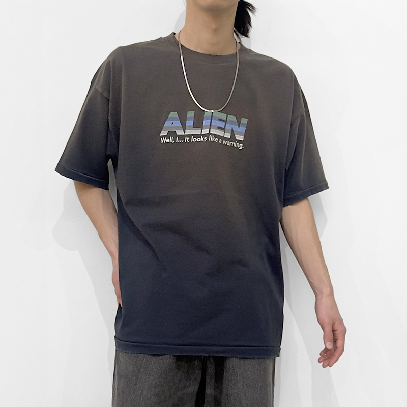 DAIRIKU(ダイリク)の"Alien" Vintage Wash H-S Tee(25SS CS3)です。シーズンのキーワードを刺繍で表現したTシャツです。今季のテーマである映画『エイリアン』(1979)にインスパイアされ、「ALIEN」の文字を刺繍でデザイン。生地には日焼け加工を施し、さらに首元と袖口にダメージ加工を加えることで、ヴィンテージライクな風合いに仕上げています。