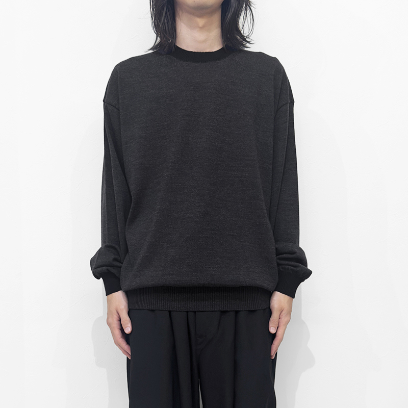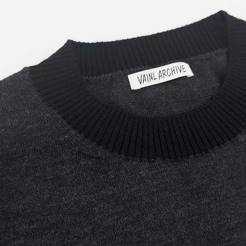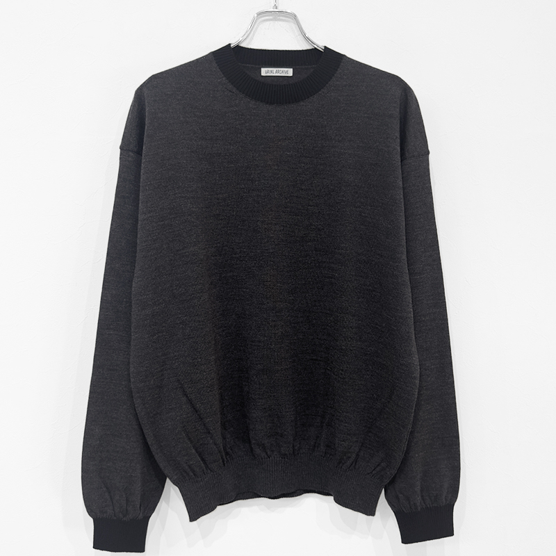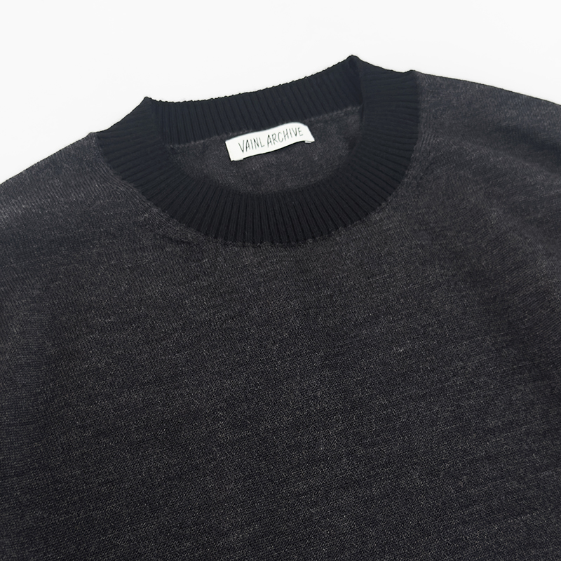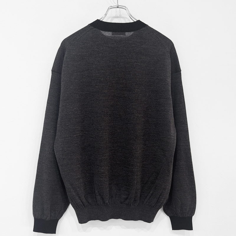VAINL ARCHIVE(ヴァイナルアーカイブ)のDaniel(VASK25F002)です。ウールSuper120’sを使用したトリムニットです。Super 120’sとは、1本の繊維がおよそ17.5ミクロン前後という極めて細い原毛を指す国際基準で、しなやかで軽やかな風合いを持つ高級素材のひとつです。この極細原毛から編み上げた本作は、柔らかで滑らかな肌触りと上品な光沢を持ち、シンプルでありながらラグジュアリーな印象を与える仕上がりとなっています。