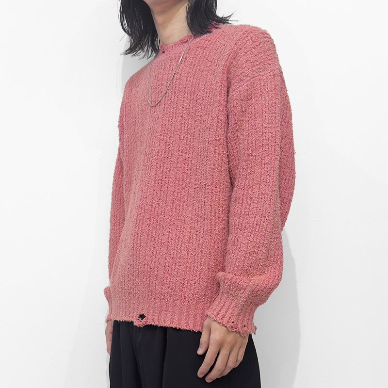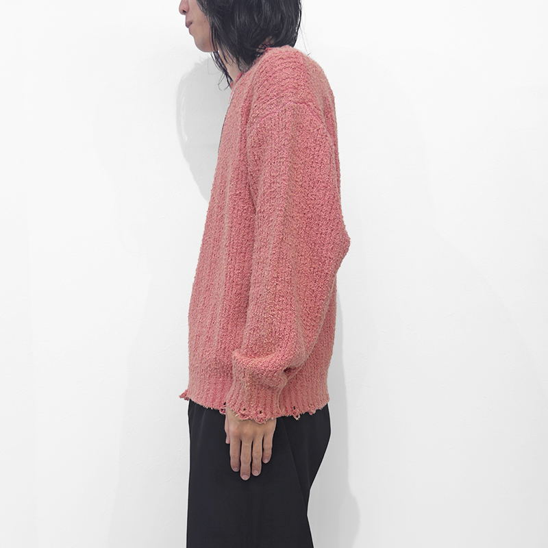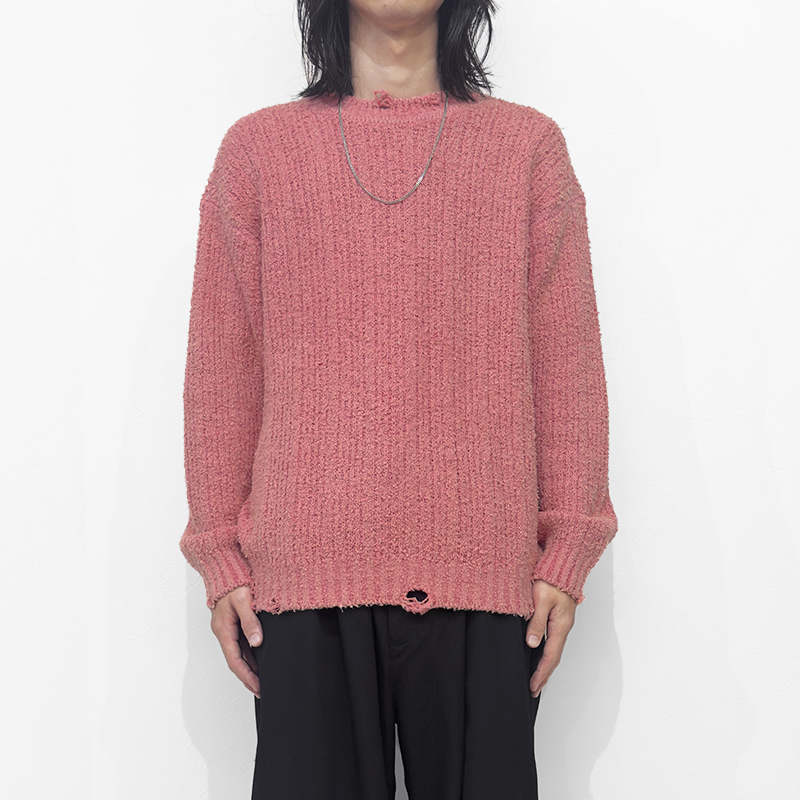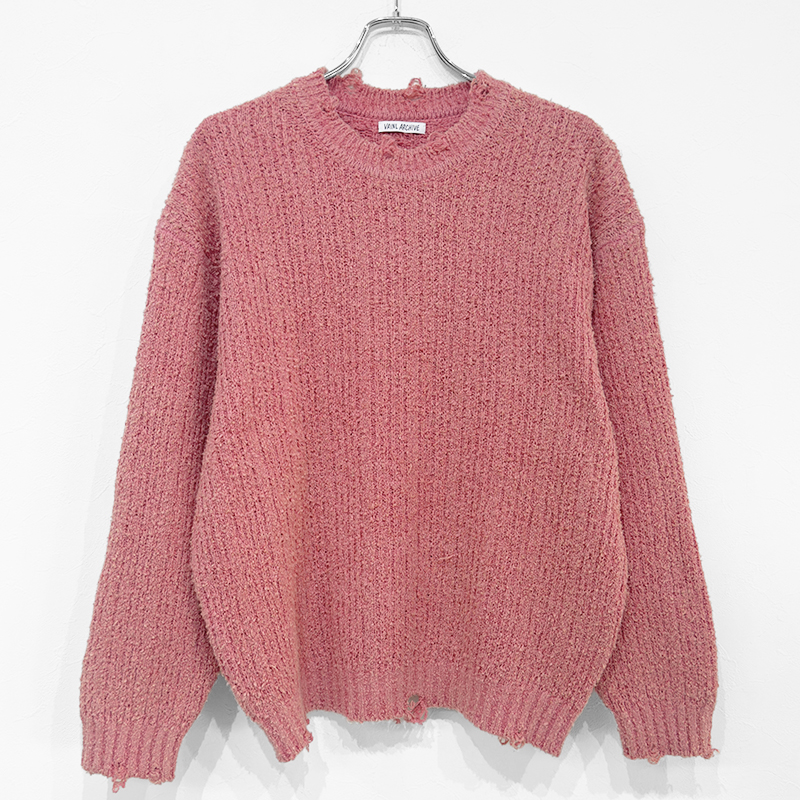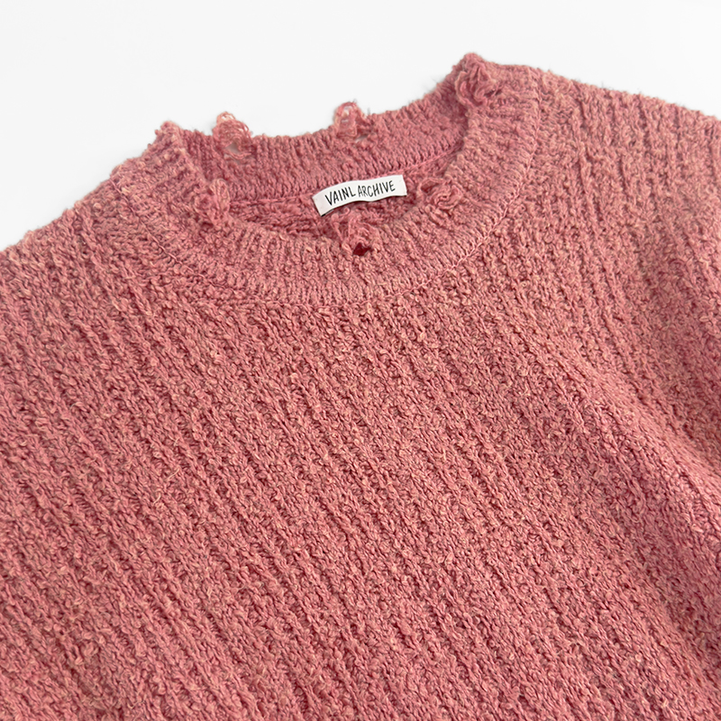 VAINL ARCHIVE(ヴァイナルアーカイブ)のJeff-D(VASK25F004)です。ヴィンテージ感漂うプルオーバーニットです。カール糸とモール糸を組み合わせて畦編みに仕立てることで、立体的で奥行きのある編地を実現。3色の染料を用いた製品染めにより、深みのある独特の色合いを表現しています。さらに、編み立ての段階で機械的にダメージを設計し、自然な経年変化を思わせる風合いに仕上げています。ご自宅での手洗いにも対応しており、日常的に取り入れやすい一着です。