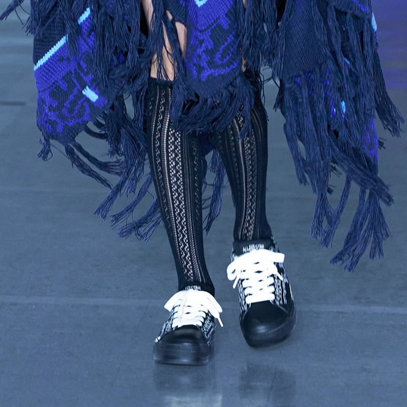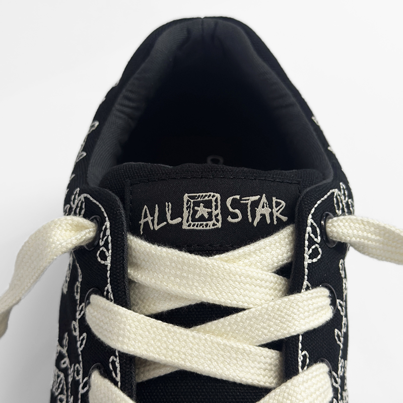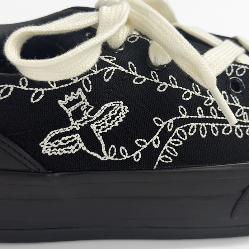SHINYAKOZUKA(シンヤコヅカ)のPICTURESQUE ANTIQUE SNEAKER WITH CONVERSE(2502SK133)です。CONVERSEとのコラボレーションによるスニーカーです。ベースには「ALL STAR BOARDERSTAR OX」を用い、柔らかなシルエットにブランド独自の叙情的な刺繍を掛け合わせています。デザインの発想は、「もしアンティークの時代に現代の技術でスニーカーが存在していたら」という想像から。パリの蚤の市で出会ったアンティークのスカラップ刺繍を着想源に、ブランドコンセプトである「絵に描いたような情景」を重ねています。モチーフには「鳥・額縁・月」を選び、すべてハンドドローイングで描き起こした上で、CONVERSEのステッチワークに沿う形で刺繍として落とし込まれています。ヒールには額縁と月を配し、ステッチワークから芽吹く草の先に鳥が羽ばたく様子をイメージ。ロゴもすべてハンドドローイングに変更されています。シューレースはホワイトとブラックの2色が付属し、スタイリングに応じてアレンジが可能です。