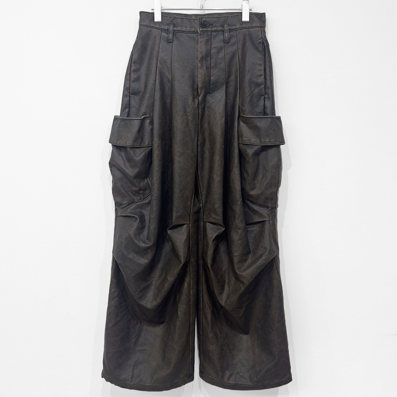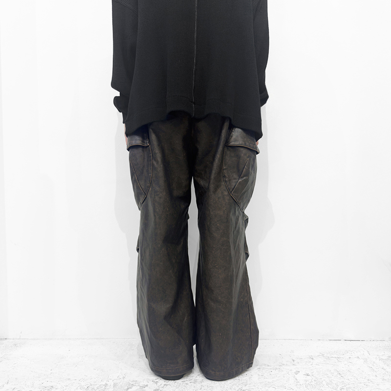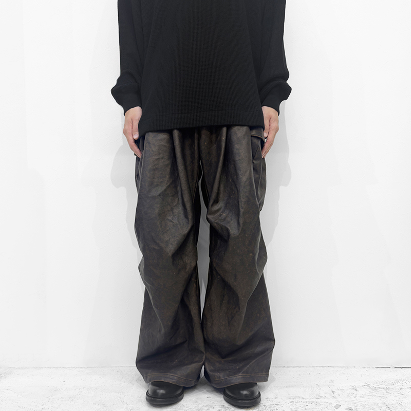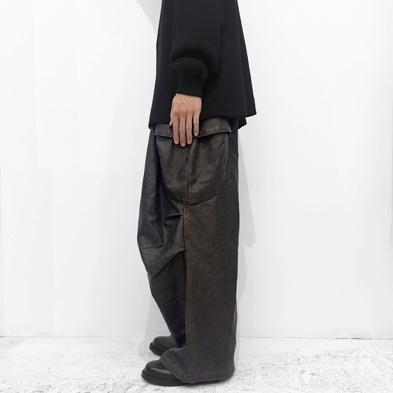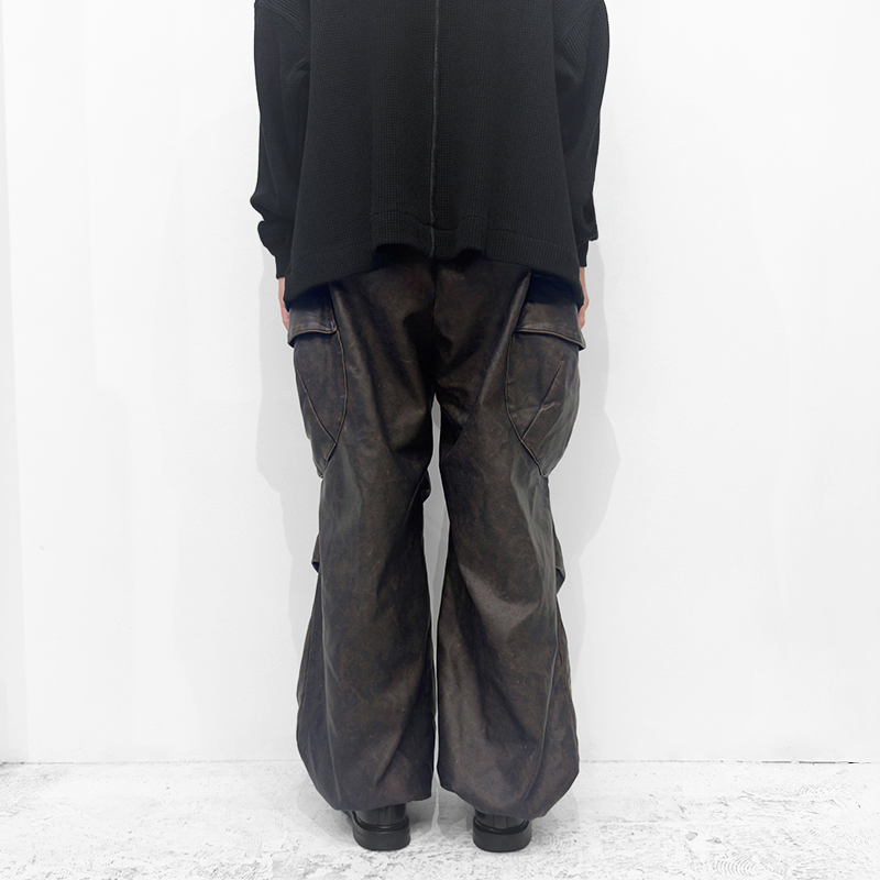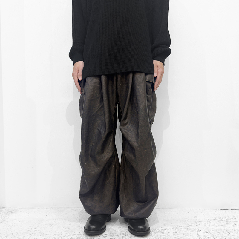 SHINYAKOZUKA(シンヤコヅカ)のMOONED DELIVERY MAN(2502SK46)です。ヴィンテージ感漂うカーゴバギーです。エイジング加工を施した合成皮革を採用し、長年使い込んだ本革のようなシワ感や色ムラを表現しています。本革に比べて軽量で扱いやすく、水や汚れにも強いため、デイリーに取り入れやすいのも魅力。自宅での洗濯にも対応しています。両サイドには月の形をモチーフにした“ムーンポケット”を配し、遊び心のあるアクセントに。裾にはドローコードを備えており、スタイルに合わせてシルエットを変化させることができます。