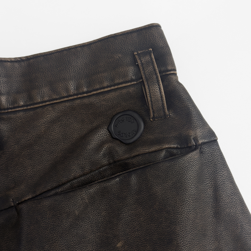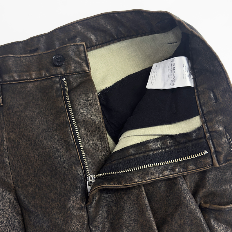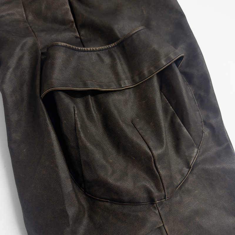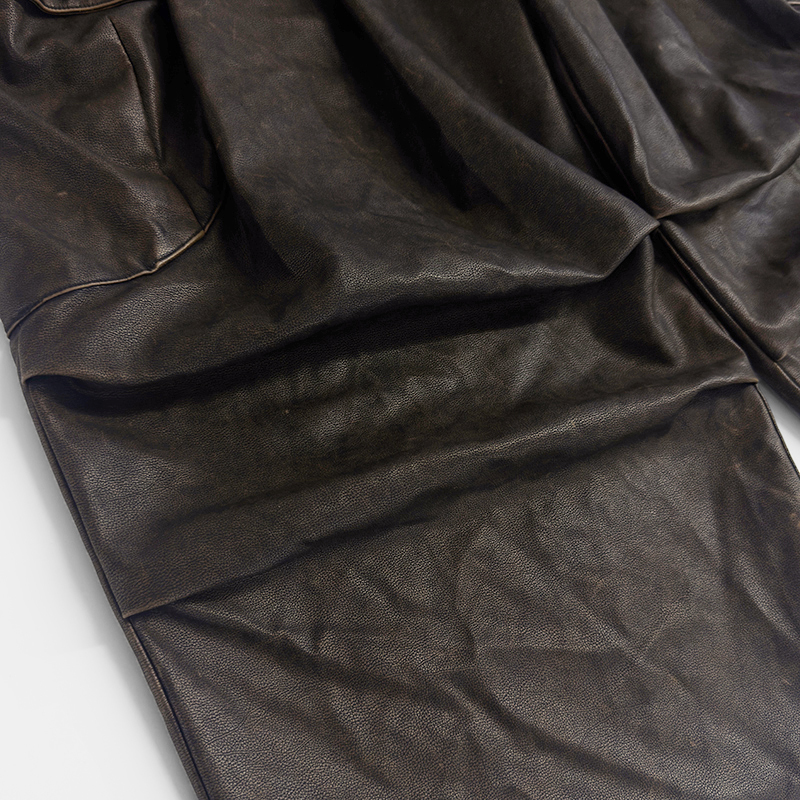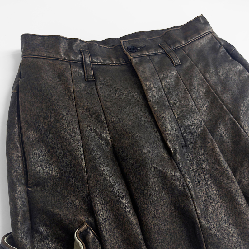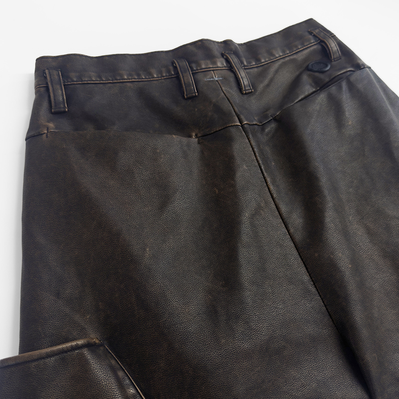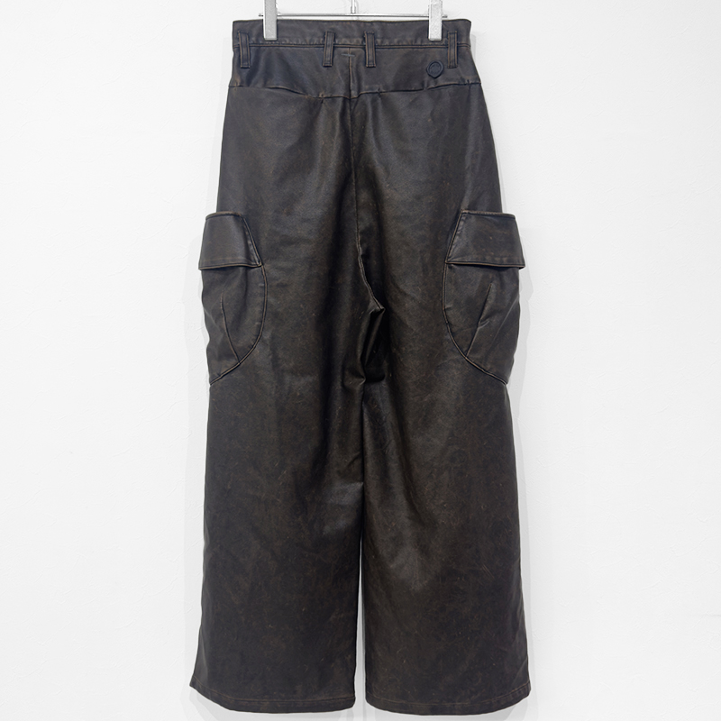 SHINYAKOZUKA(シンヤコヅカ)のMOONED DELIVERY MAN(2502SK46)です。ヴィンテージ感漂うカーゴバギーです。エイジング加工を施した合成皮革を採用し、長年使い込んだ本革のようなシワ感や色ムラを表現しています。本革に比べて軽量で扱いやすく、水や汚れにも強いため、デイリーに取り入れやすいのも魅力。自宅での洗濯にも対応しています。両サイドには月の形をモチーフにした“ムーンポケット”を配し、遊び心のあるアクセントに。裾にはドローコードを備えており、スタイルに合わせてシルエットを変化させることができます。
