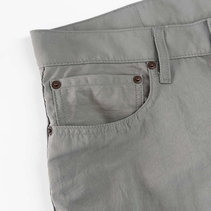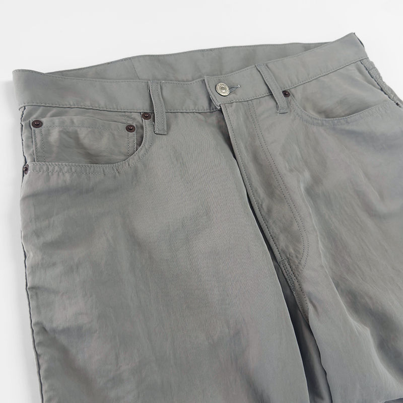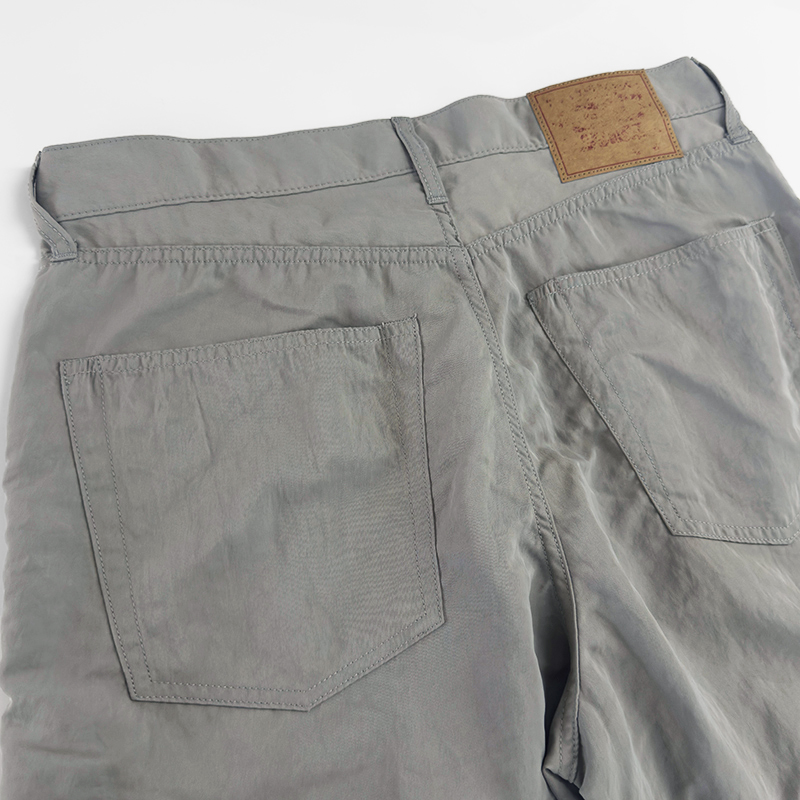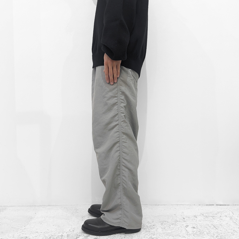 UNUSED(アンユーズド)のNylon pants(UW1181)です。デニムパンツのディテールを取り入れたナイロンパンツです。素材にはリサイクルナイロンを使用した耐久性のあるツイル地を採用。あえてシワを残す加工を施すことで、ナイロン特有の無機質さを抑えた独特の表情を引き出しています。サイドシームに生まれるパッカリングもデザインのアクセントに。さらに、撥水性を長く保ちながら環境への負担を軽減するフッ素フリー撥水剤を使用しており、機能性と快適な着心地を兼ね備えた一本に仕上がっています。