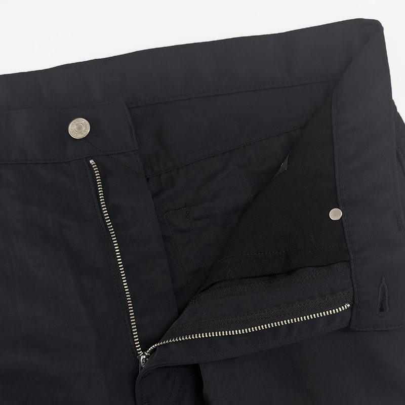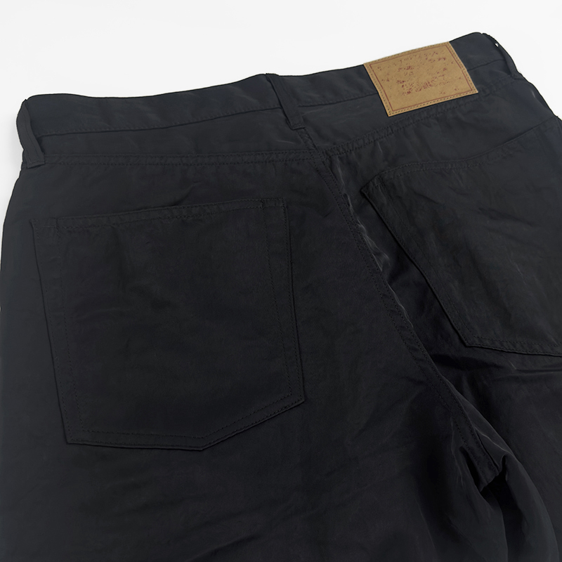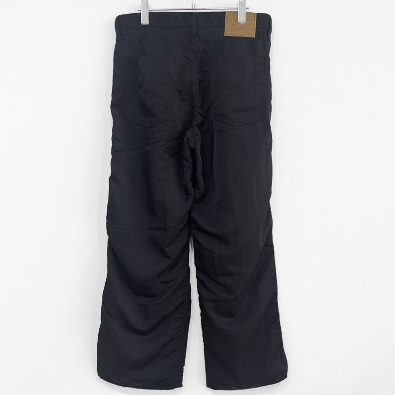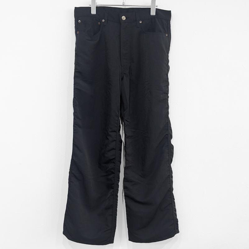 UNUSED(アンユーズド)のNylon pants(UW1181)です。デニムパンツのディテールを取り入れたナイロンパンツです。素材にはリサイクルナイロンを使用した耐久性のあるツイル地を採用。あえてシワを残す加工を施すことで、ナイロン特有の無機質さを抑えた独特の表情を引き出しています。サイドシームに生まれるパッカリングもデザインのアクセントに。さらに、撥水性を長く保ちながら環境への負担を軽減するフッ素フリー撥水剤を使用しており、機能性と快適な着心地を兼ね備えた一本に仕上がっています。