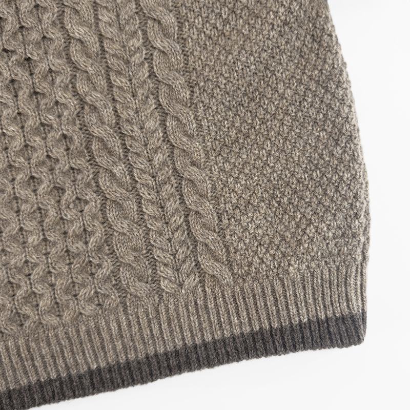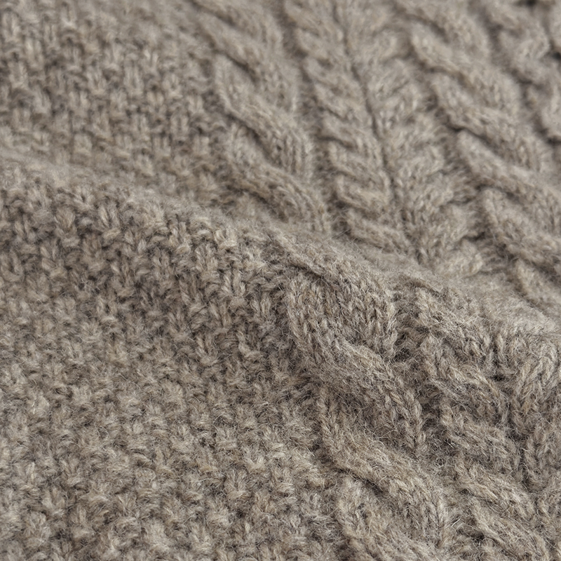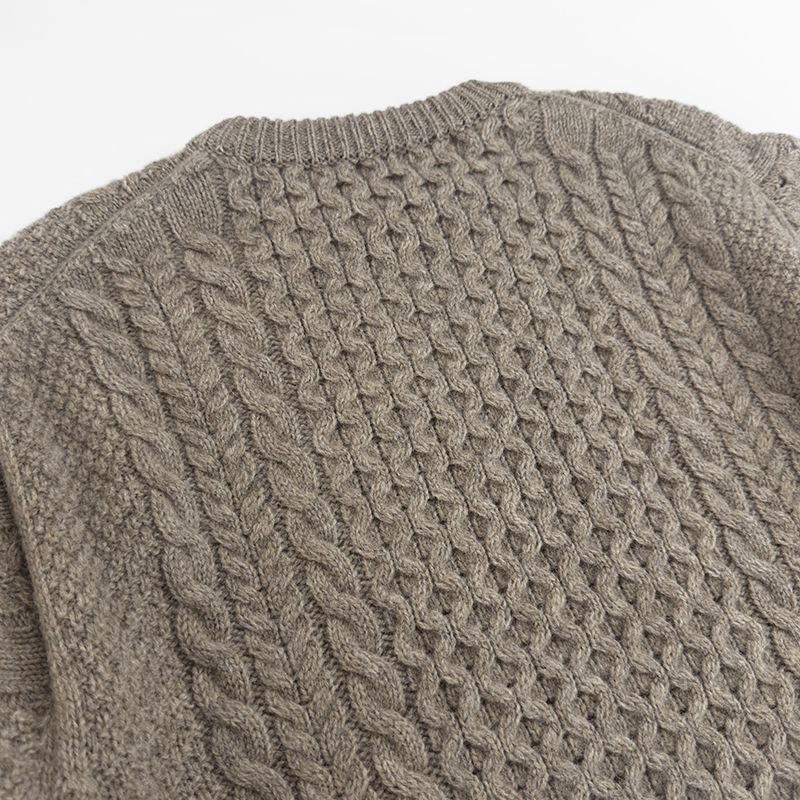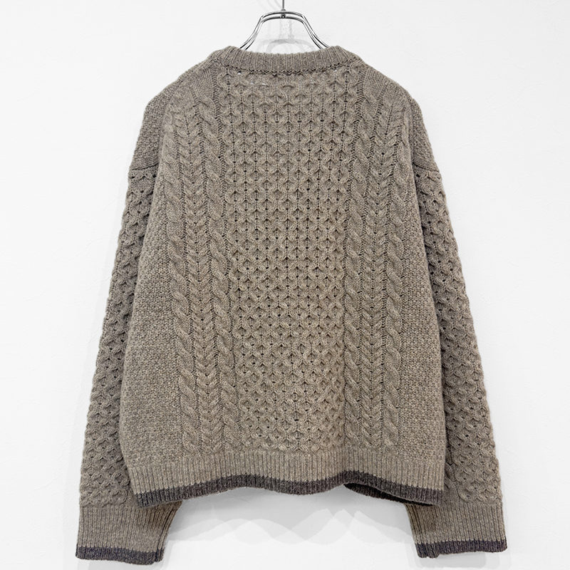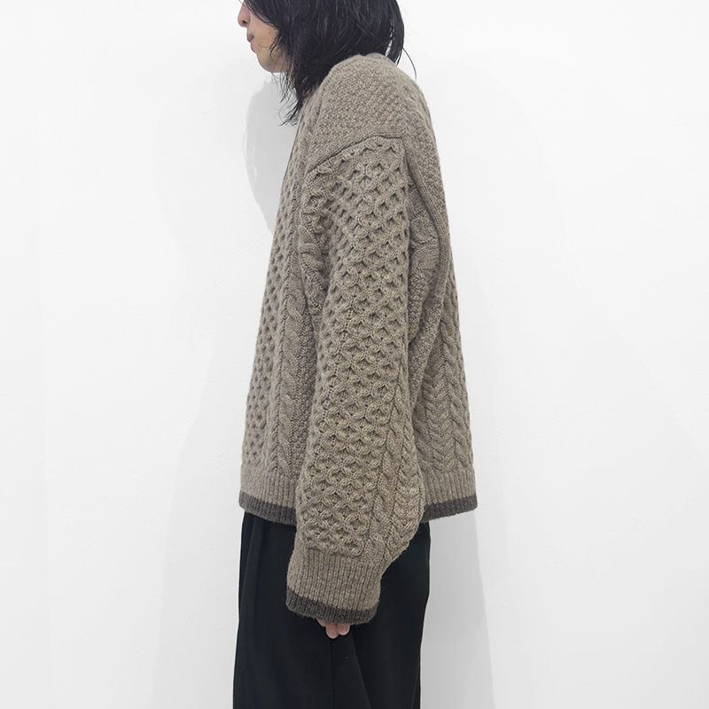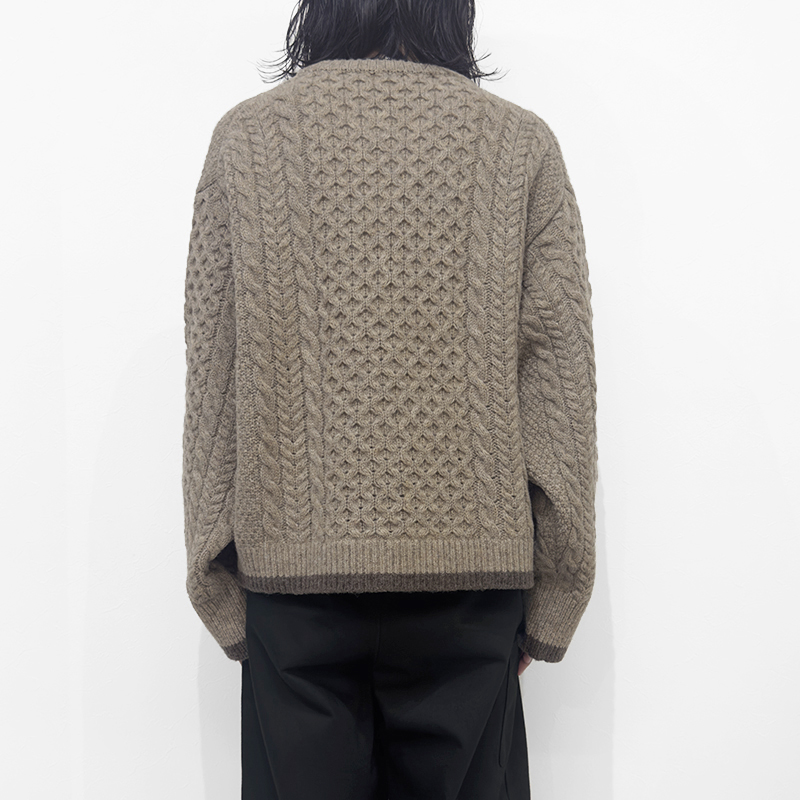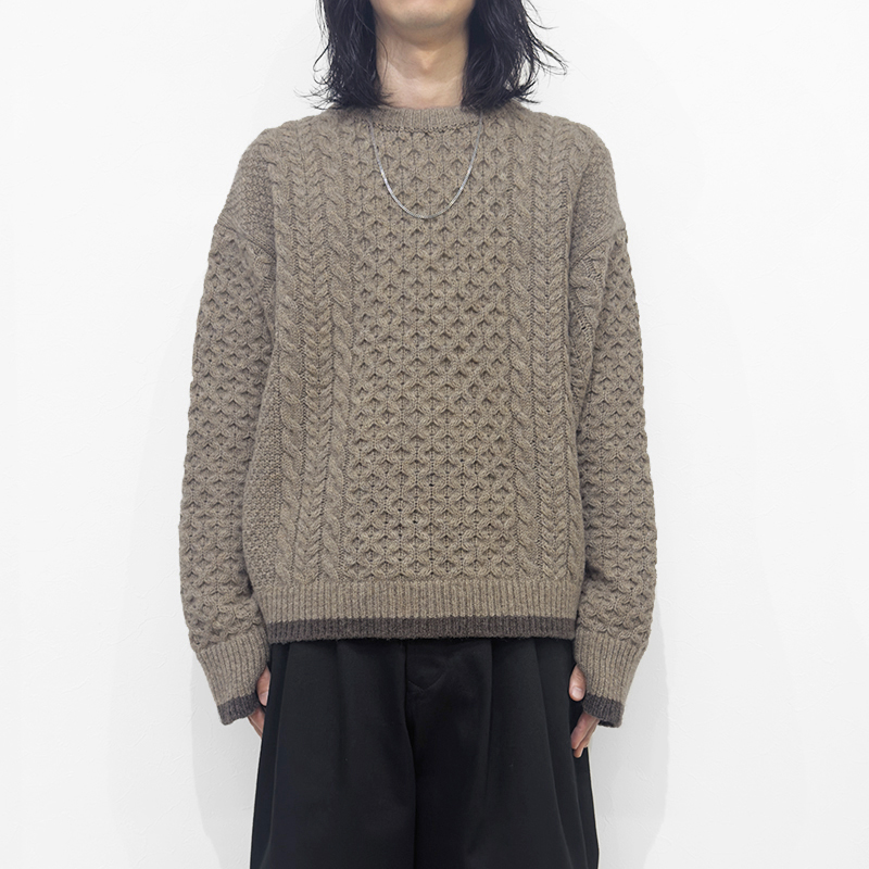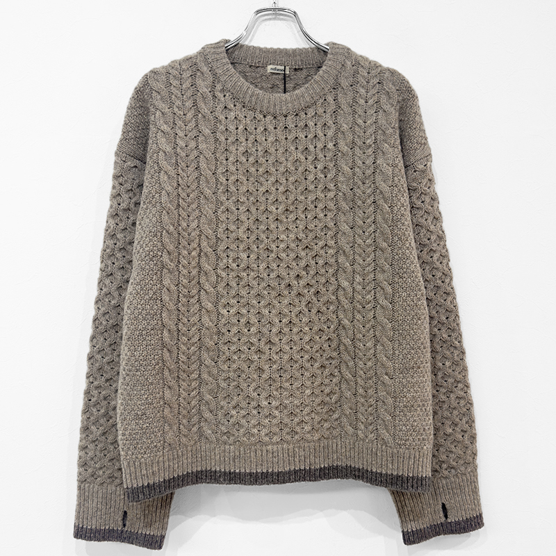 refomed(リフォメッド)の"GUNTE" KNIT SWEATER(REKN-010)です。作業現場に欠かせない“軍手”をモチーフにしたプルオーバーニットです。軍手の色は、安全上の理由から目立つ色を選ぶ場合や、汚れが目立ちにくい色、日焼けに強い色を選ぶ場合など、環境や規定によって使い分けられています。その背景を着想源にし、実際に存在する軍手の配色をデザインに取り入れています。素材には、ハリのあるドライタッチのウール糸を使用。適度な硬さを持つ糸がケーブル編みの立体感を際立たせ、存在感のある仕上がりになっています。