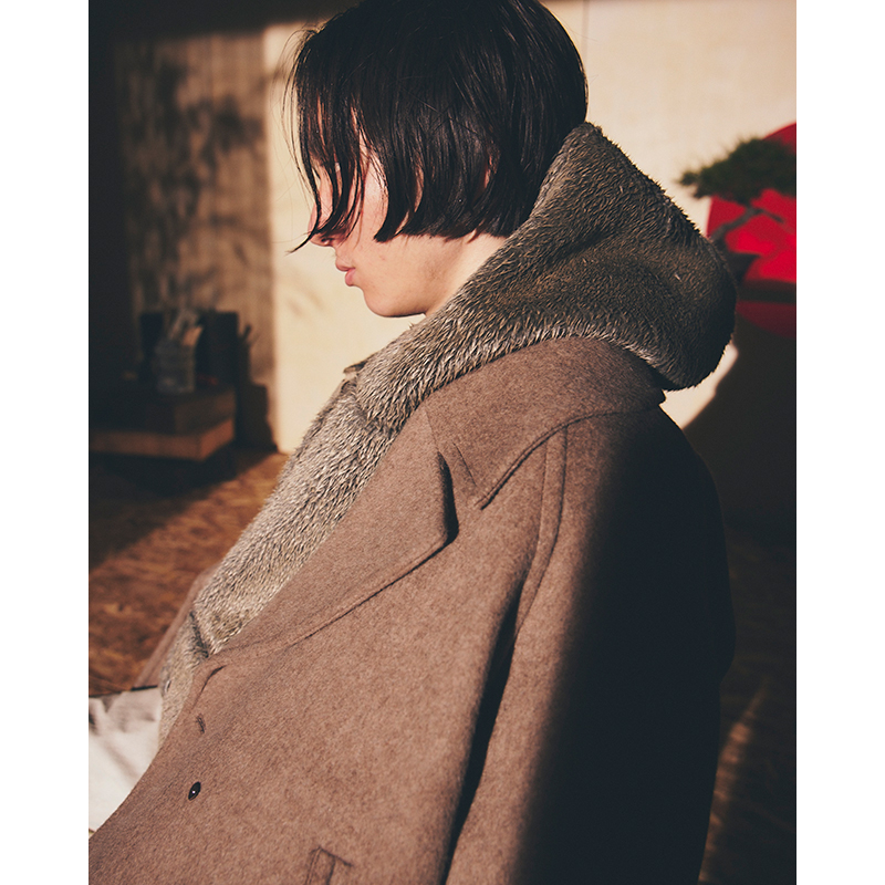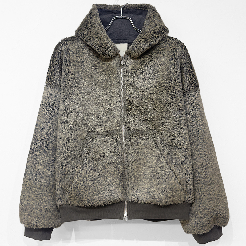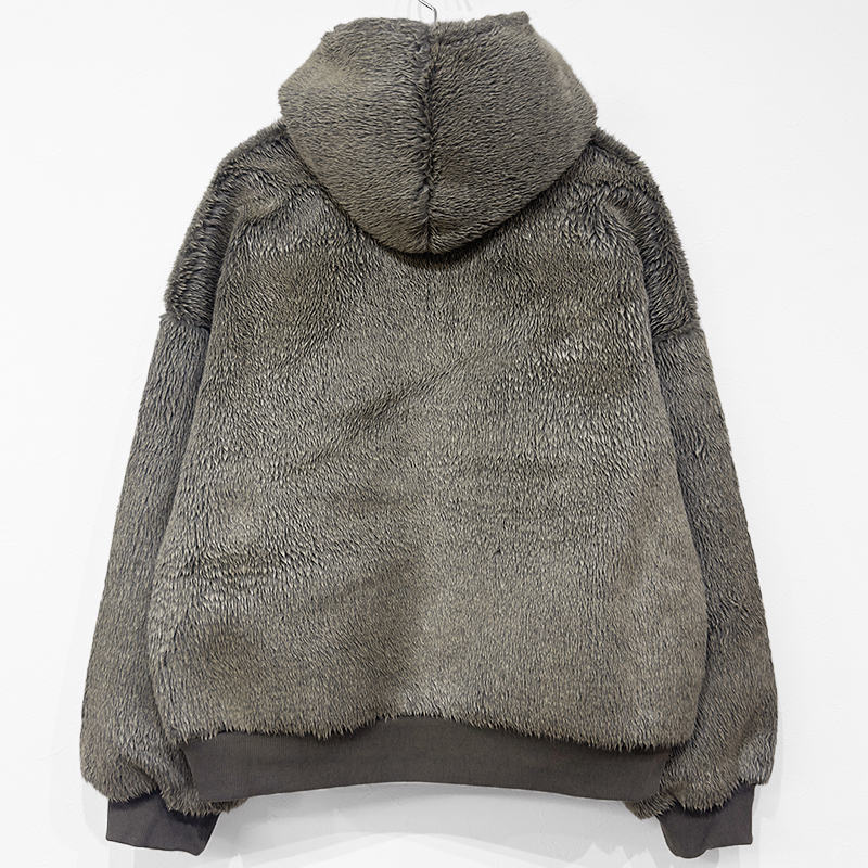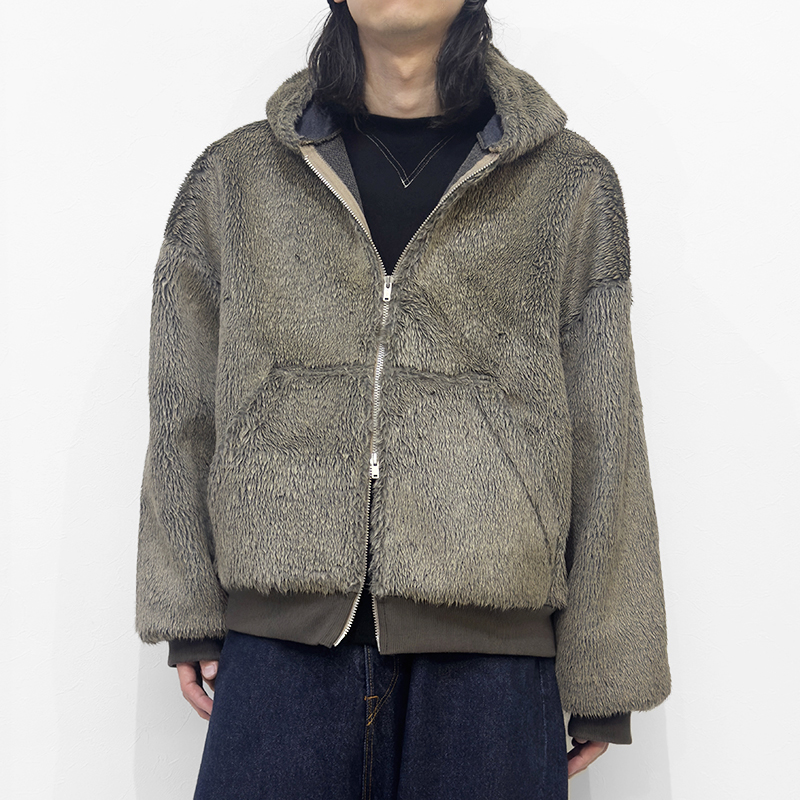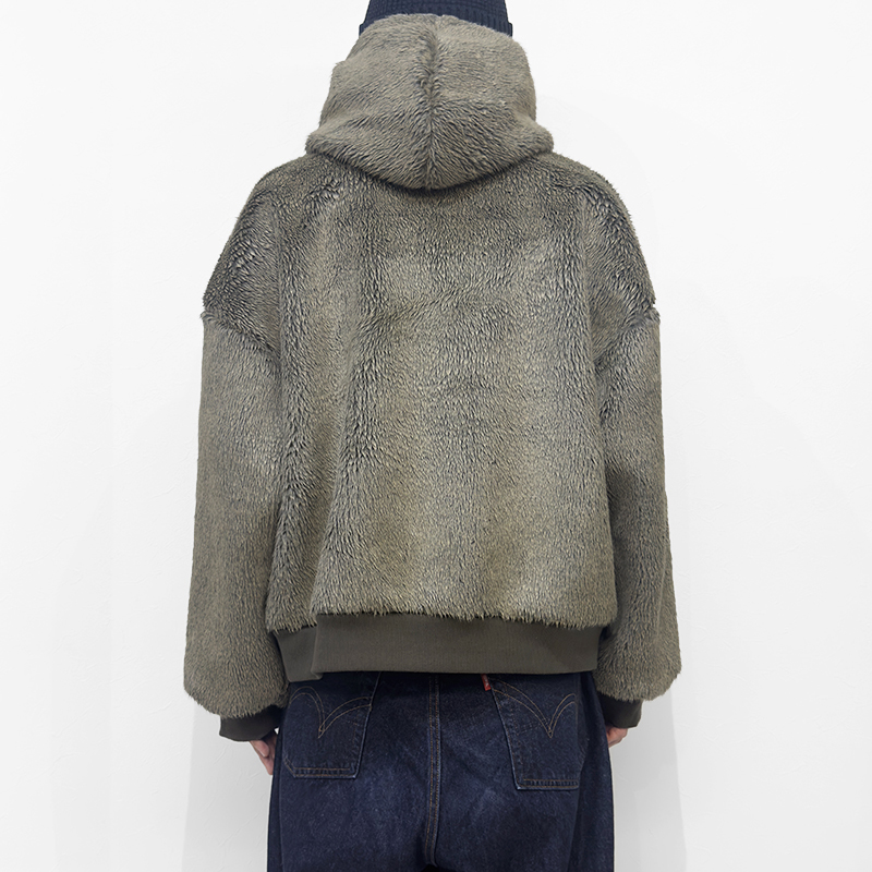 refomed(リフォメッド)のCASTRO BOA HOODIE(RECU-053)です。作業現場で用いられる防寒着から着想を得たボアパーカーです。「カストロ(ビーバー)」という名前には、“働き者”という意味が込められており、真冬に現場で働く職人をイメージしています。素材には毛足のあるボアを使用し、毛先に顔料加工を施すことで、独特のムラ感と深みのある表情を演出。質感のコントラストが際立つ、存在感のある仕上がりです。着用を重ねることで表面の糊が落ち、経年による風合いの変化も楽しめます。