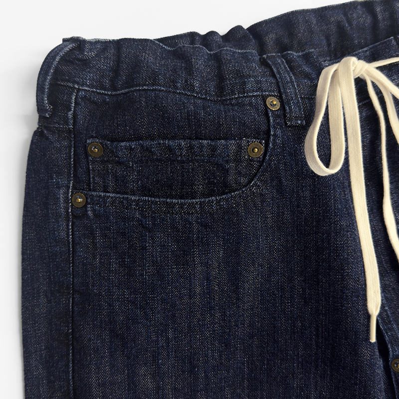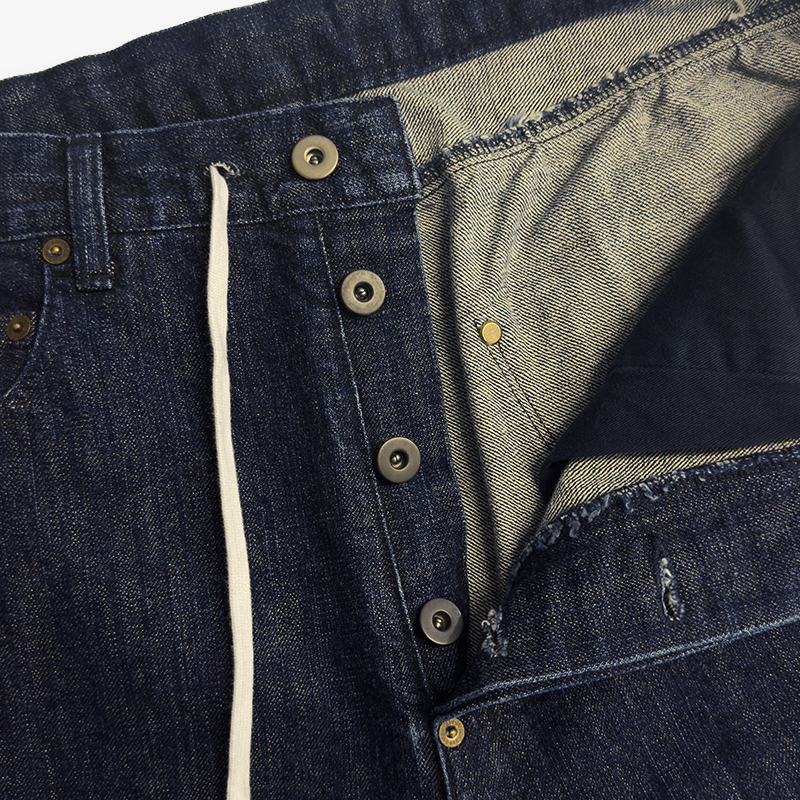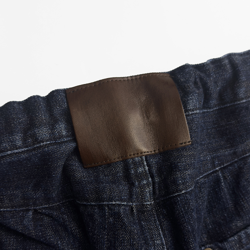 refomed(リフォメッド)のOLD MAN DENIM WIDE PANTS "SB"(REPT-049)です。熟練の職人の体型をイメージして仕立てられたデニムパンツです。ゆとりを持たせたウエストと、裾に配置したプロテクターを想起させるレザーパッチが特徴です。生地には縦落ちの表情が楽しめる14.5ozデニムを採用。穿き込むほどに色調や質感に変化が生まれ、深い味わいが育っていきます。