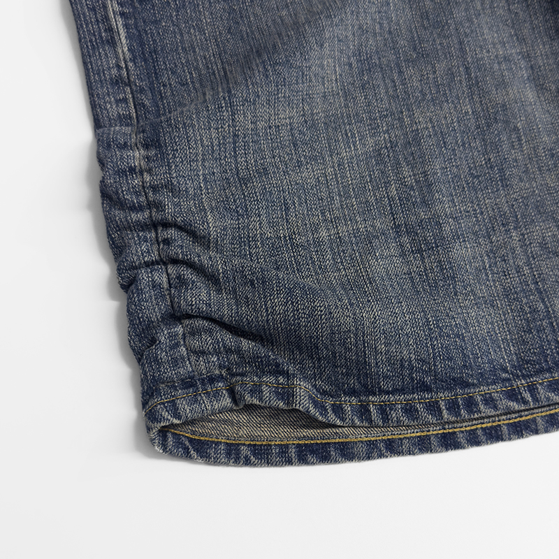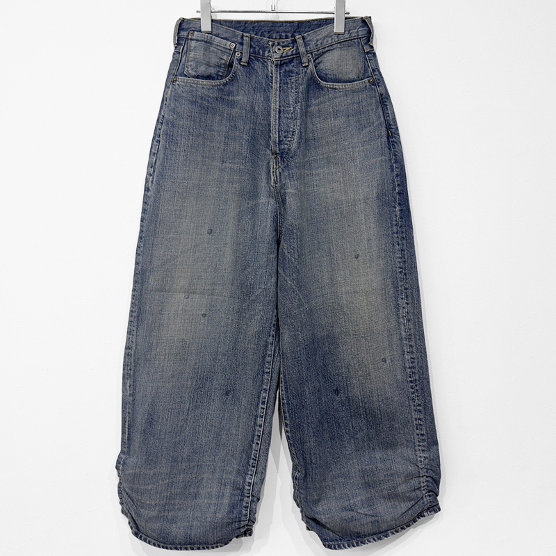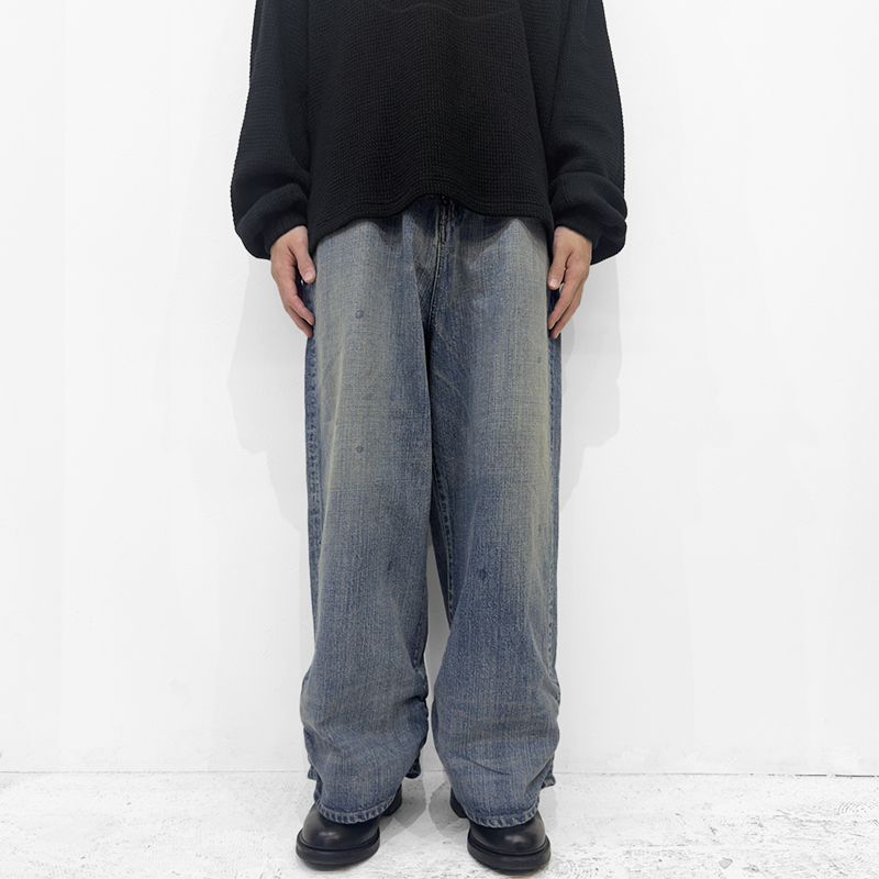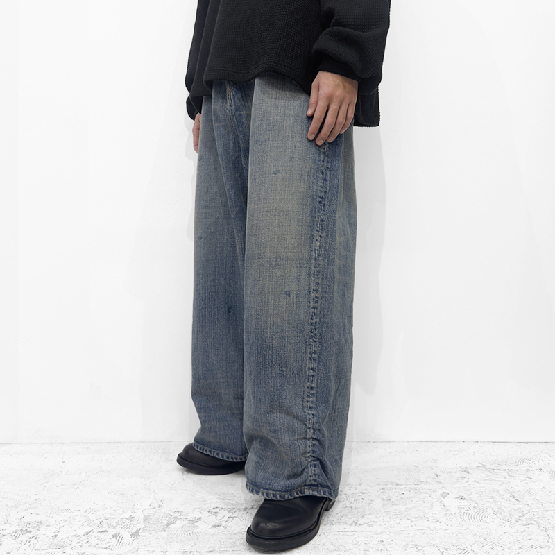 refomed(リフォメッド)のFRESH MAN DENIM WIDE PANTS "USED"(REPT-050U)です。裾のギャザーが特徴的なワイドデニムパンツです。職人たちがシルエットで個性を表現してきた文化に着想を得て、「超超ワイド」や「5超」などの極太スタイルをベースに再構築。裾にはゴムギャザーを施し、着用時に自然なクッションが生まれるよう設計されています。生地には縦落ちの表情が楽しめる14.5ozデニムを採用。穿き込むほどに色調や質感に変化が生まれ、深い味わいが育っていきます。