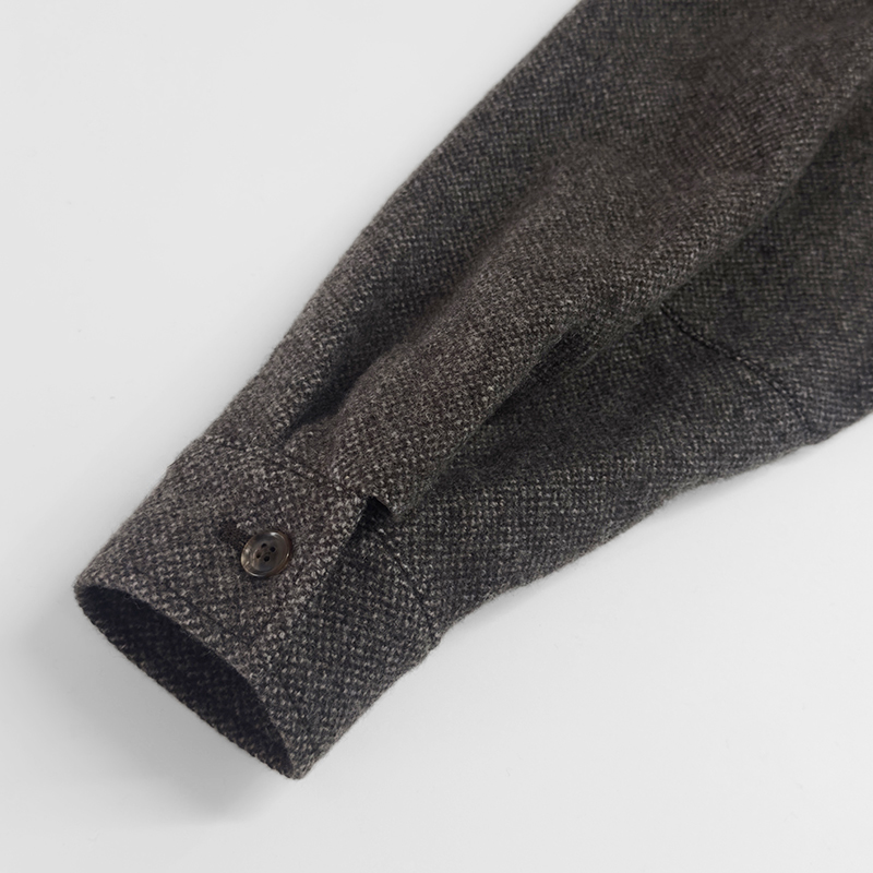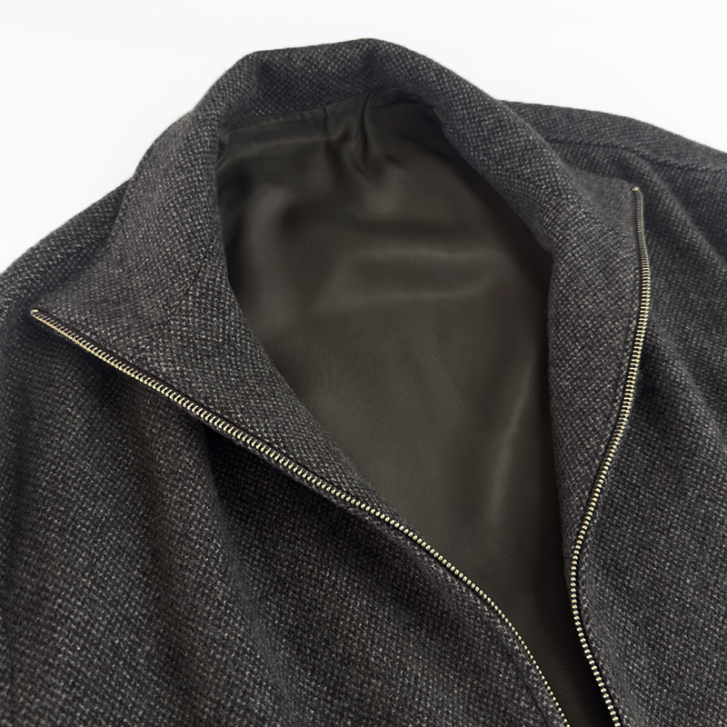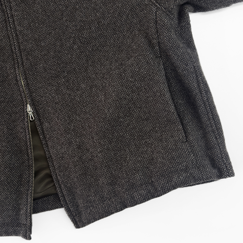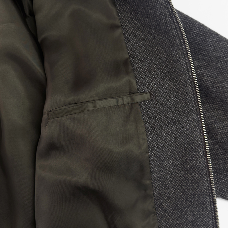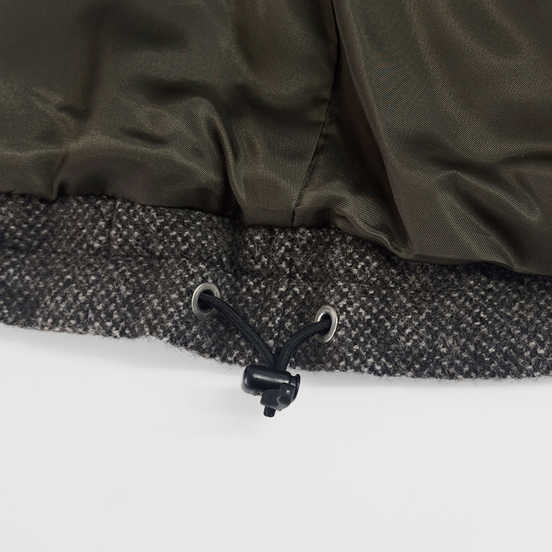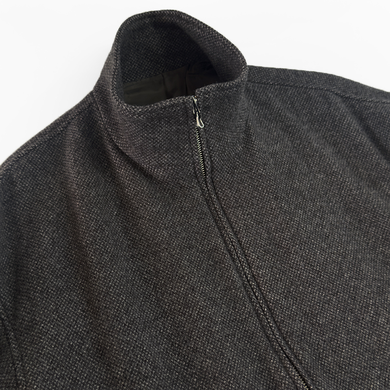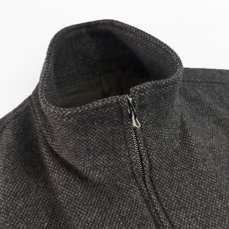 URU(ウル)のWOOL LIGHT TWEED ZIP UP BLOUSON(25FWLT02)です。ウールツイード生地を使用したジップアップブルゾンです。従来のツイードよりも糸の本数を減らし、織り密度をゆるめることで、軽やかな風合いを実現。さらに縮絨工程に工夫を加え、柔らかく肌触りの良い仕上がりにしています。ダブルジップ仕様と裾のドローコードにより、シルエットに変化をつけて着用することができます。