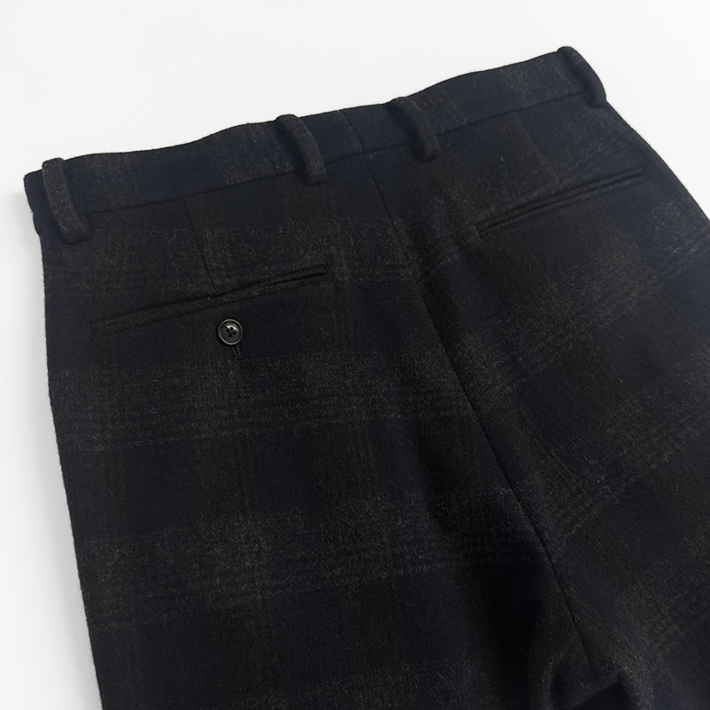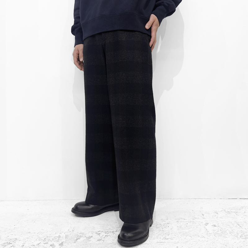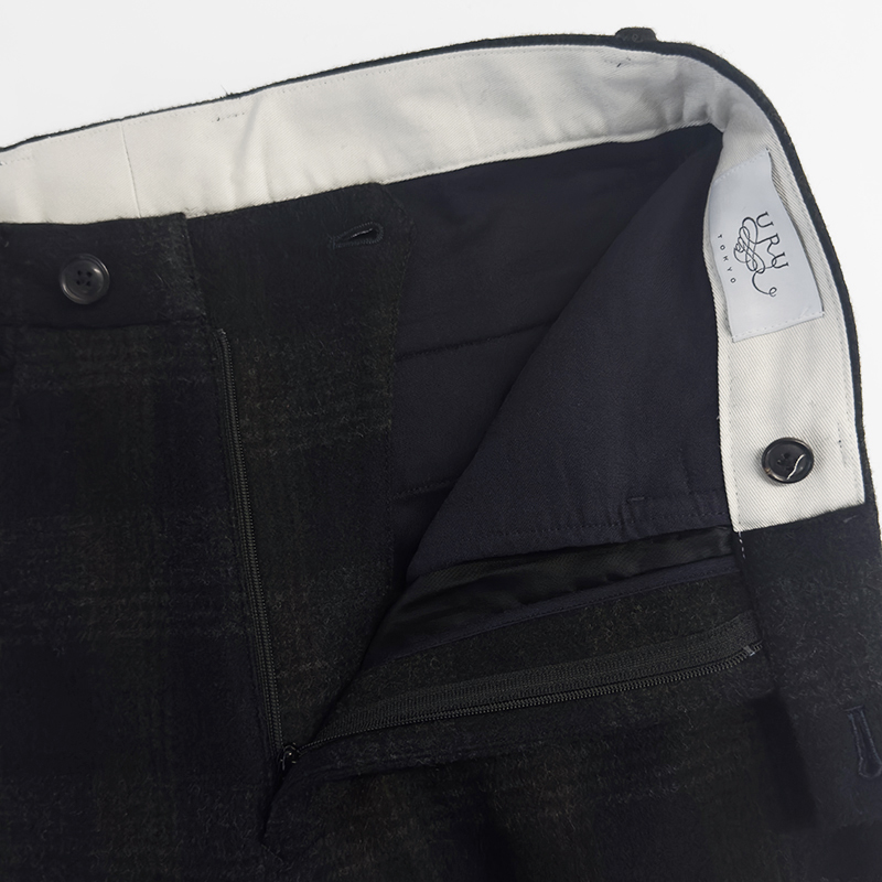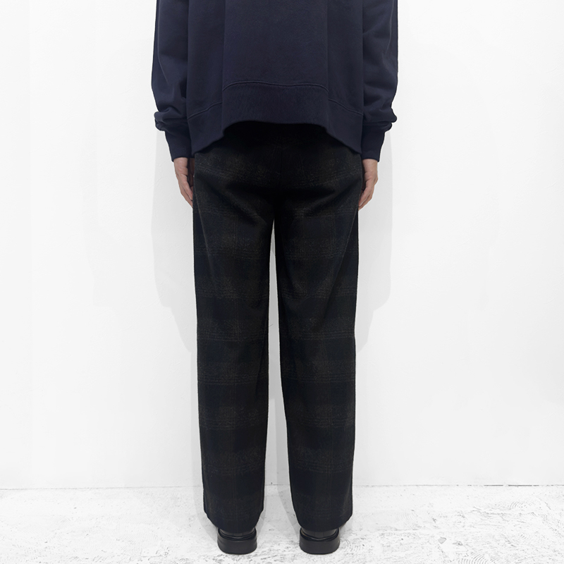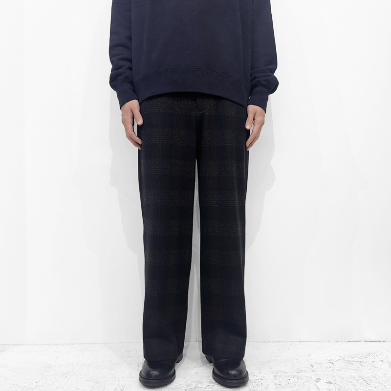 URU(ウル)のWOOL GLENCHECK WIDE PANTS(25FWGC02)です。ウールメルトン素材を使用したワイドパンツです。通常のメルトンとは異なり、独自の工程によって軽やかな質感に仕上げた生地を採用。グレンチェック柄でありながら柄の主張を抑え、無地のように見える配色にまとめることで、落ち着いた上品な表情を生み出しています。デザインはワークパンツをベースにしつつ、ステッチワークを極力控えることでクリーンで洗練された印象に。前裏仕立てを採用し、穿き心地にも配慮した一本です。