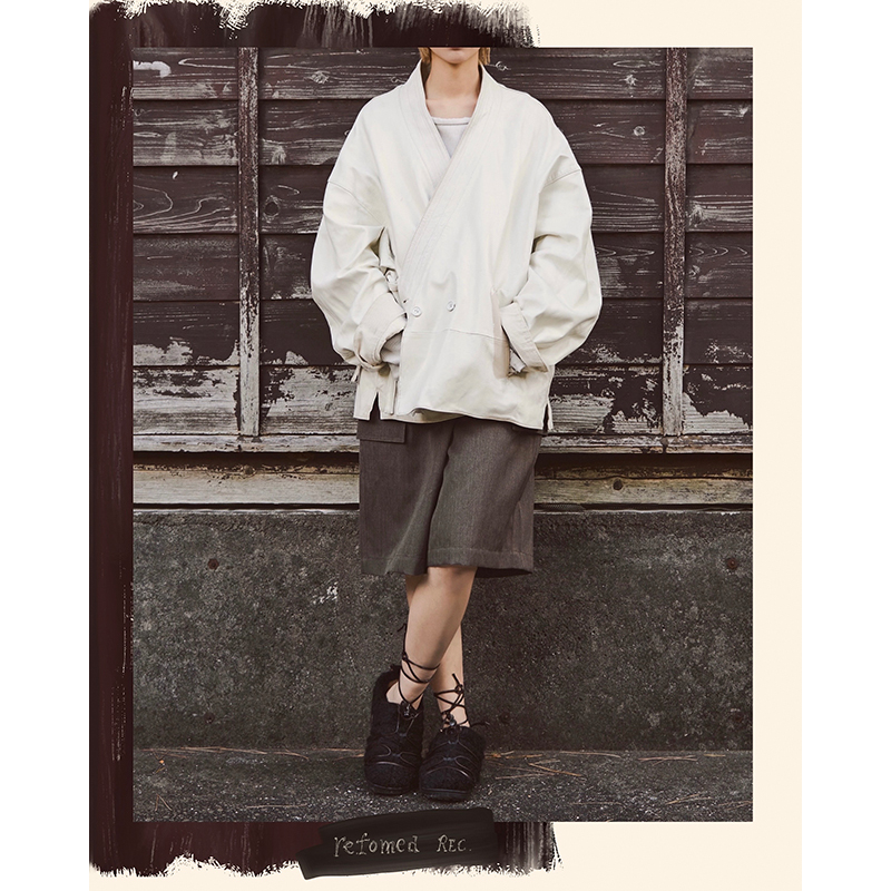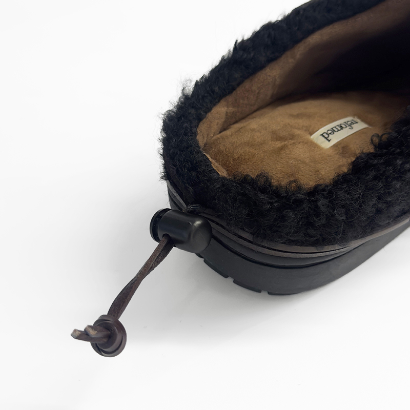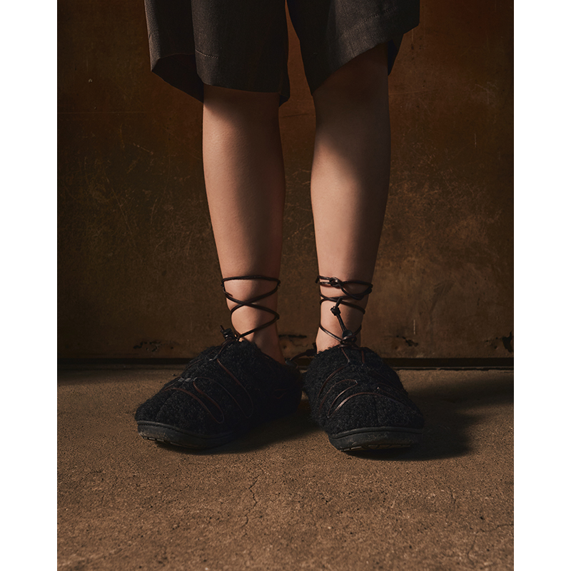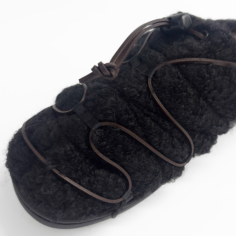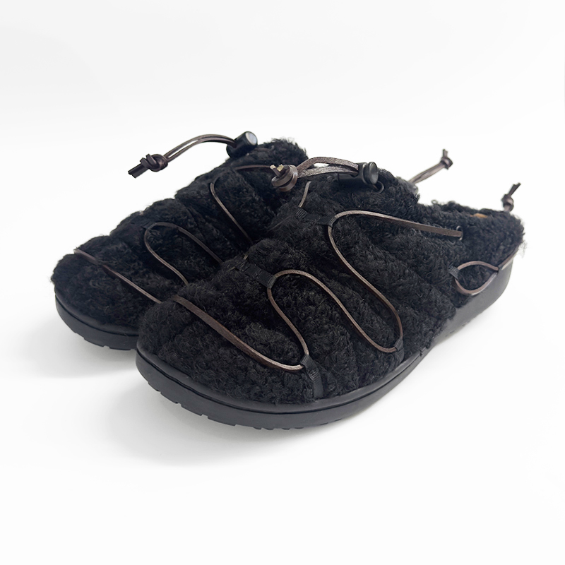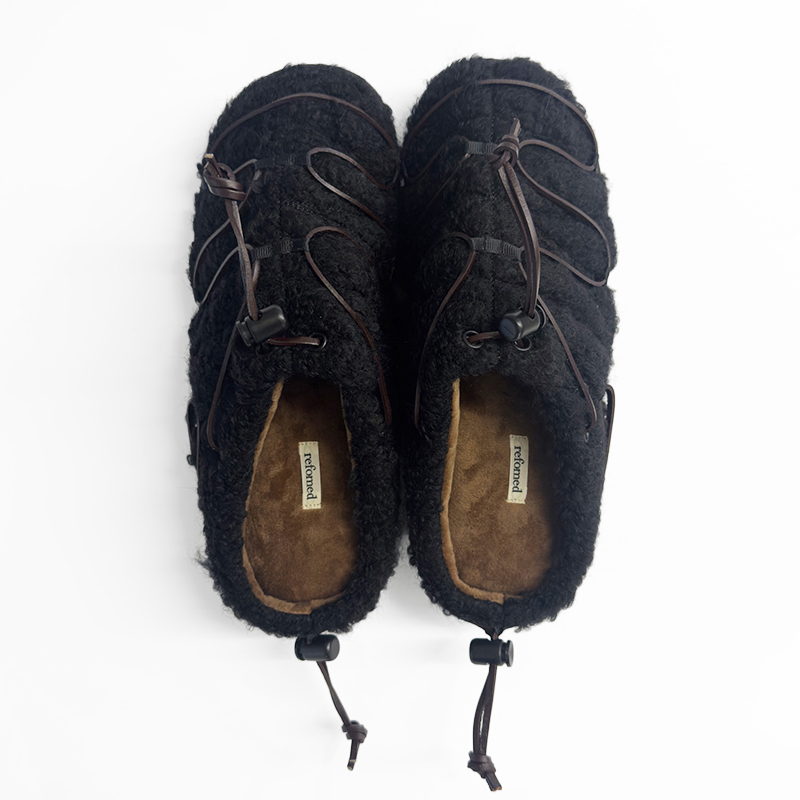 refomed(リフォメッド)のF-LINE refomed SUBU(REAC-SB001)です。SUBUとのコラボレーションによるボアサンダルです。シグネチャーモデル「F-LINE」をベースに、暖かみのあるウールボア素材を採用しています。着想源となったのは、草鞋(わらじ)で長い道のりを歩いていた時代に、余った紐を脚に巻き付けて血流を守った “血止め” の文化。その知恵をモチーフに、本革のロープを足元に巡らせることで、素朴な機能美を現代的に再構築しています。装飾的になりすぎず、無骨さにも寄りすぎない、ほどよい存在感と奥行きのある表情が魅力です。アッパーには、ボアの中にさりげなく走らせたオリジナルステッチを配置し、杉綾テープでまとめることで、静かに物語性をのせたデザインに仕上げています。歴史的背景を現代のスタイルの中でさりげなく響かせる一足です。