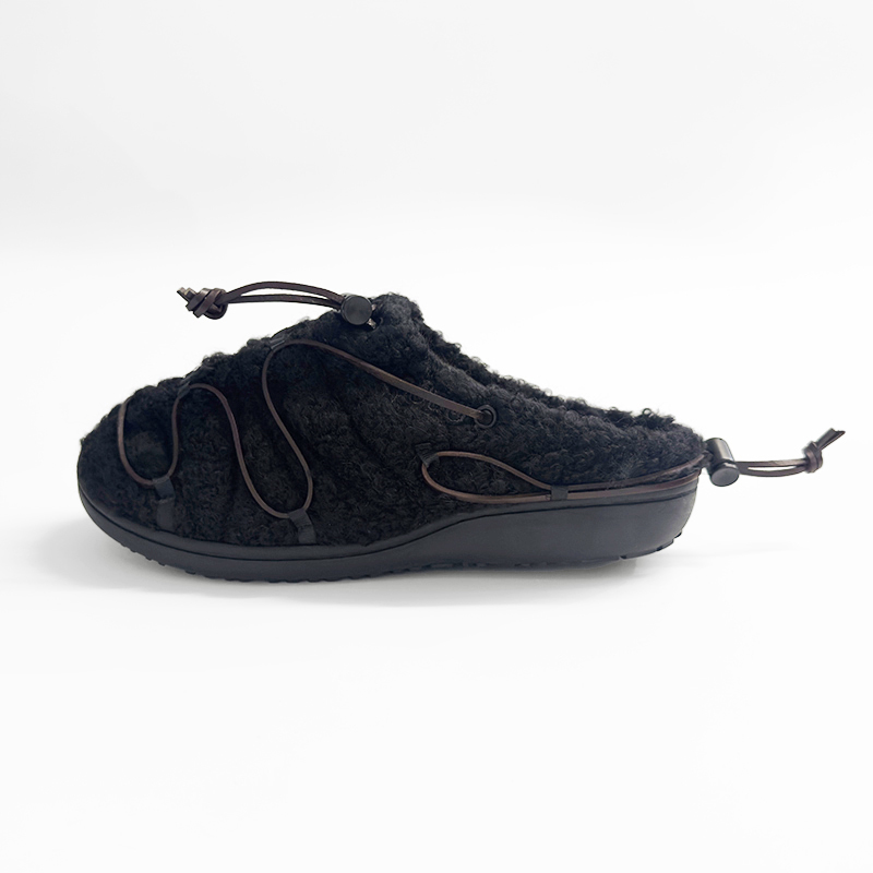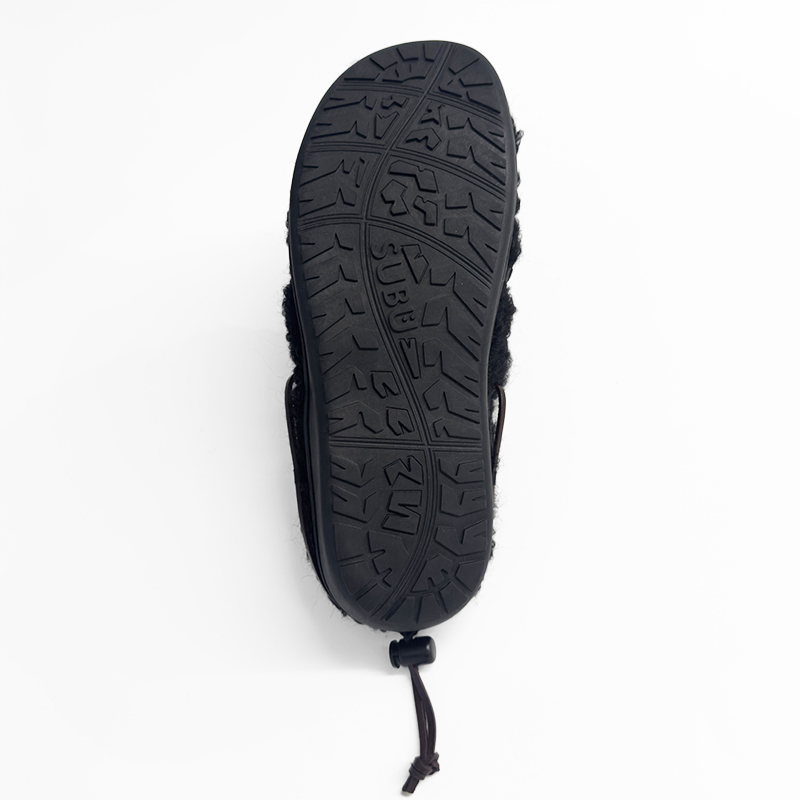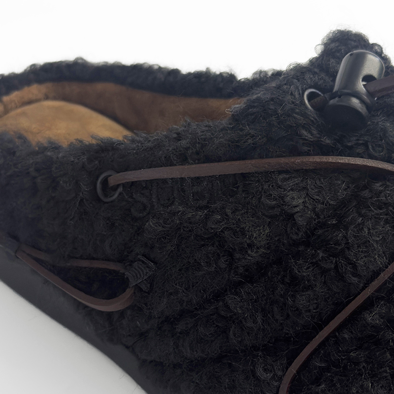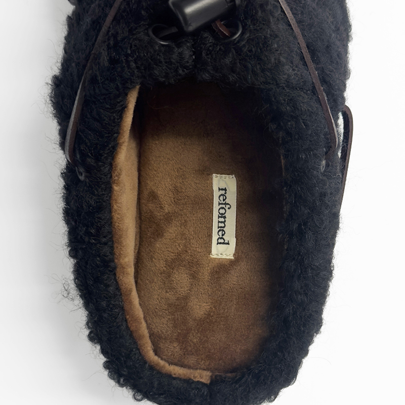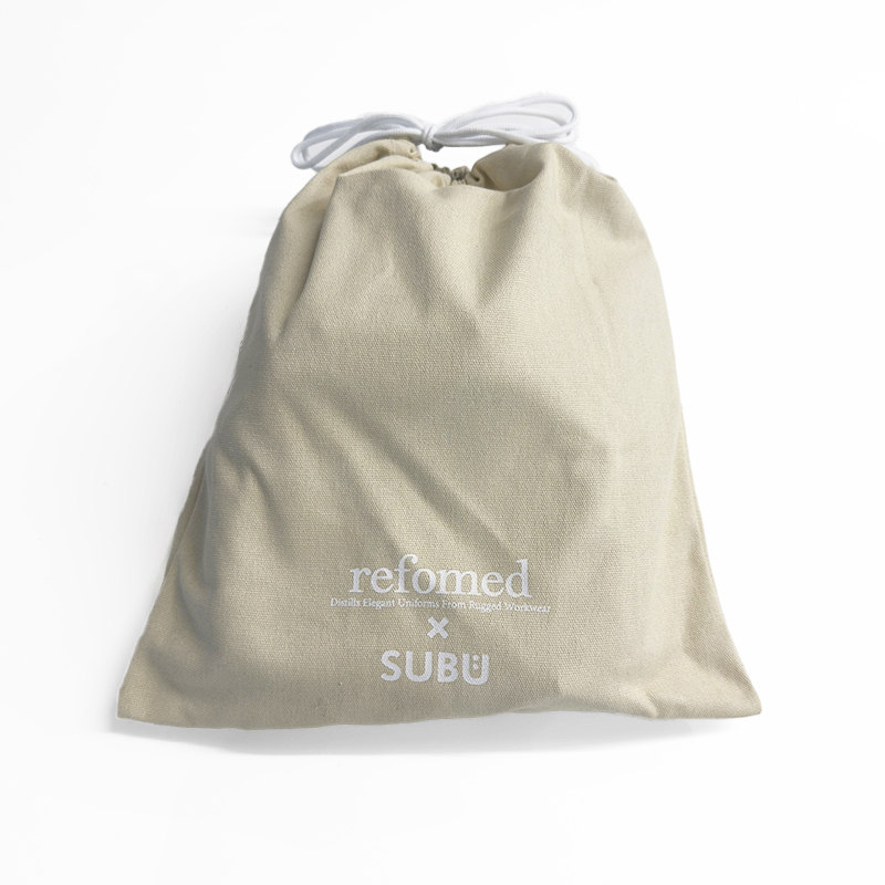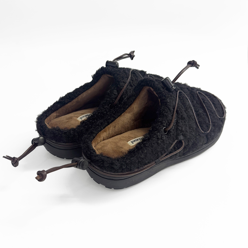 refomed(リフォメッド)のF-LINE refomed SUBU(REAC-SB001)です。SUBUとのコラボレーションによるボアサンダルです。シグネチャーモデル「F-LINE」をベースに、暖かみのあるウールボア素材を採用しています。着想源となったのは、草鞋(わらじ)で長い道のりを歩いていた時代に、余った紐を脚に巻き付けて血流を守った “血止め” の文化。その知恵をモチーフに、本革のロープを足元に巡らせることで、素朴な機能美を現代的に再構築しています。装飾的になりすぎず、無骨さにも寄りすぎない、ほどよい存在感と奥行きのある表情が魅力です。アッパーには、ボアの中にさりげなく走らせたオリジナルステッチを配置し、杉綾テープでまとめることで、静かに物語性をのせたデザインに仕上げています。歴史的背景を現代のスタイルの中でさりげなく響かせる一足です。