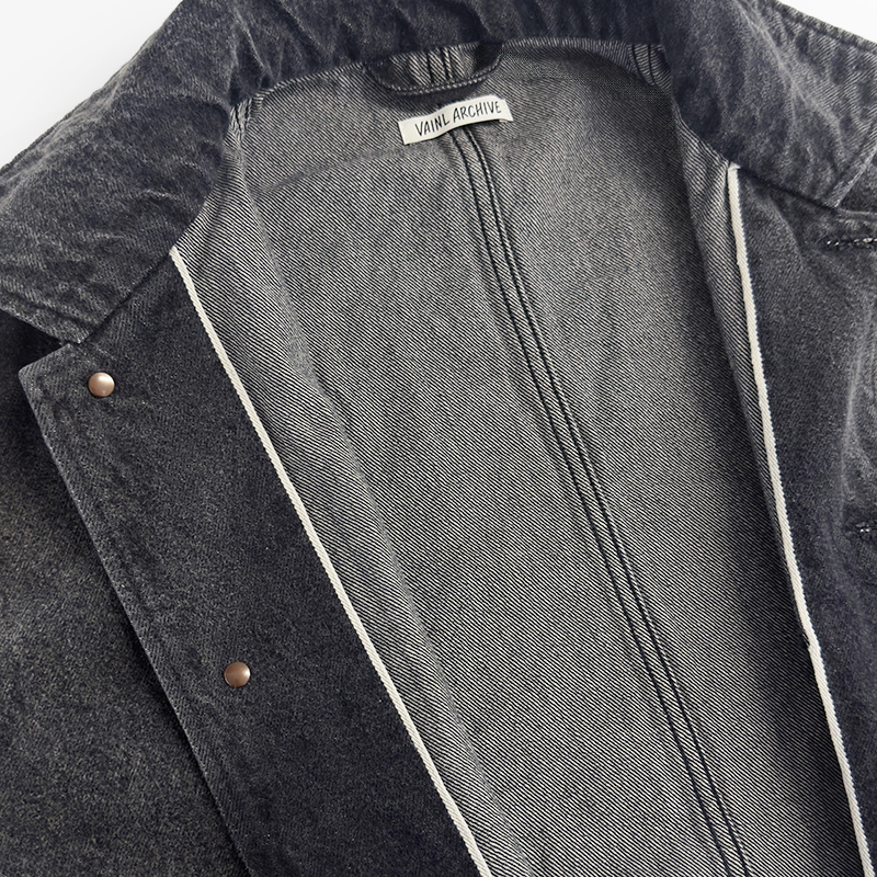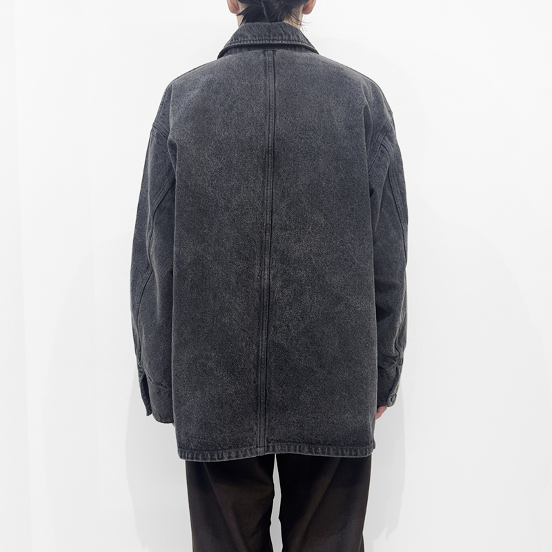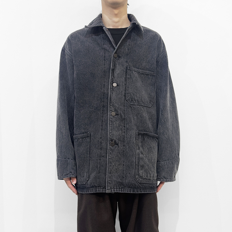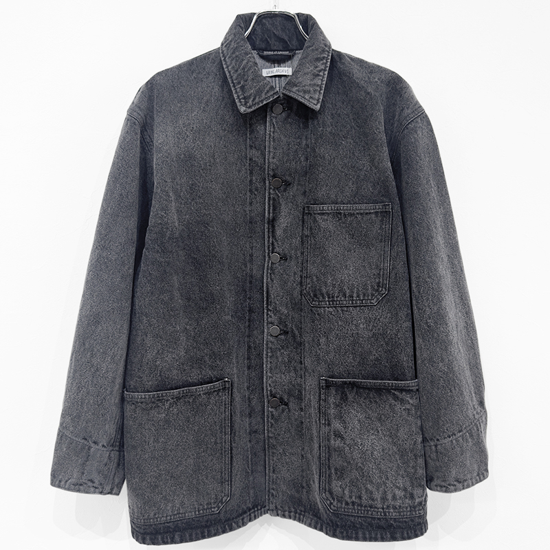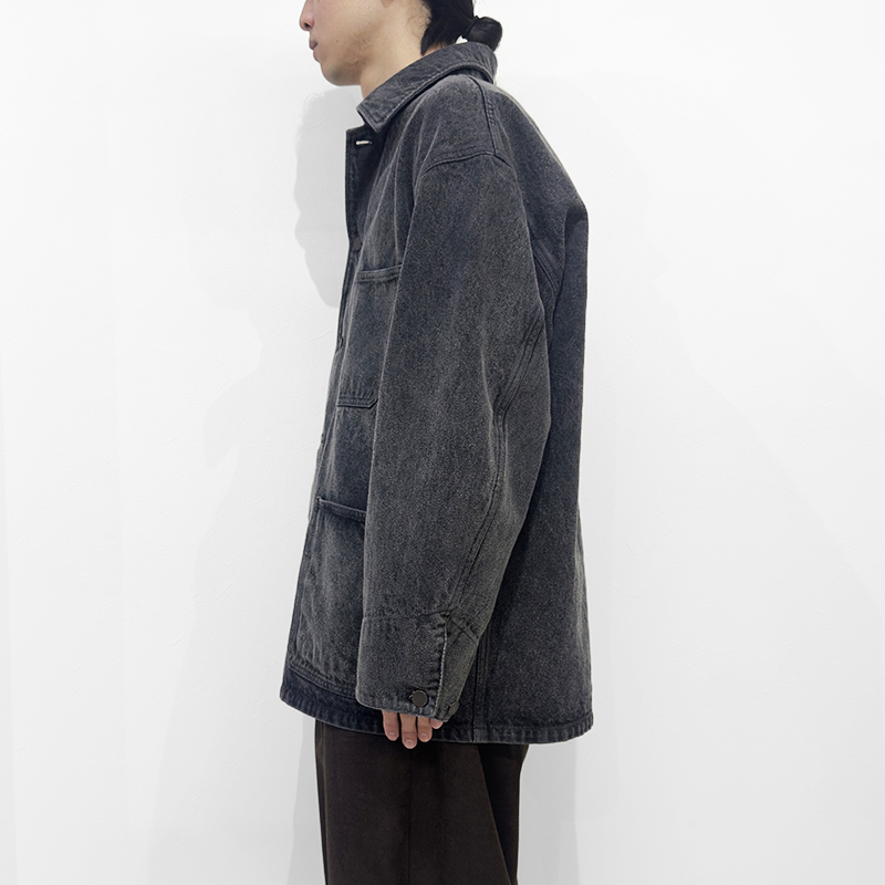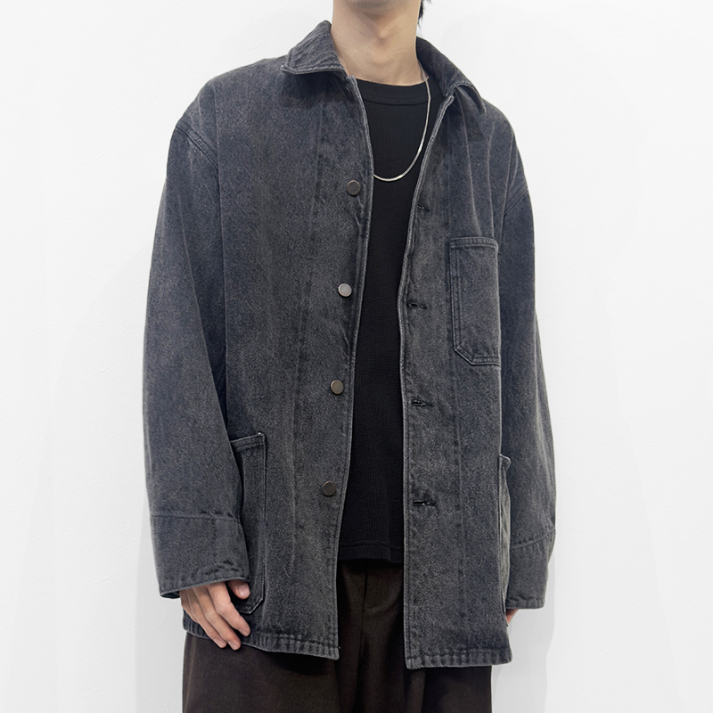 VAINL ARCHIVE(ヴァイナルアーカイブ)のTino BD(VAH25F004)です。デニム生地を使用したカバーオールジャケットです。14ozデニムをベースに、製品後にボールバイオ加工とミストブリーチ加工を施すことで、自然なアタリと奥行きのあるフェード感を表現。ワークウェアらしい無骨な佇まいを残しつつ、柔らかく着慣らしたような風合いに仕上げています。