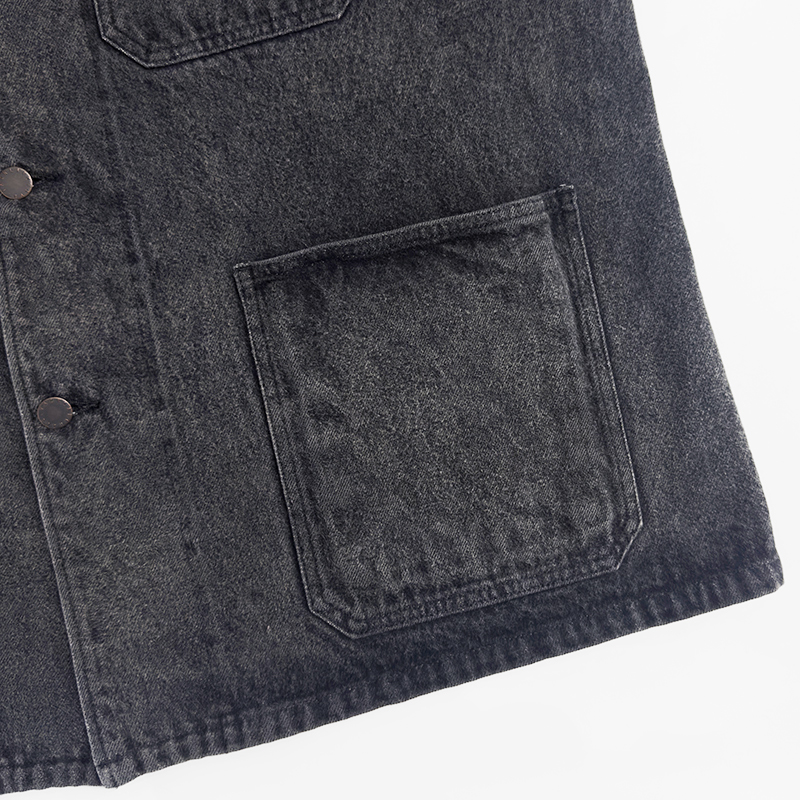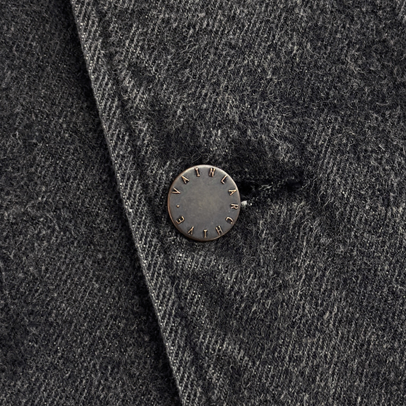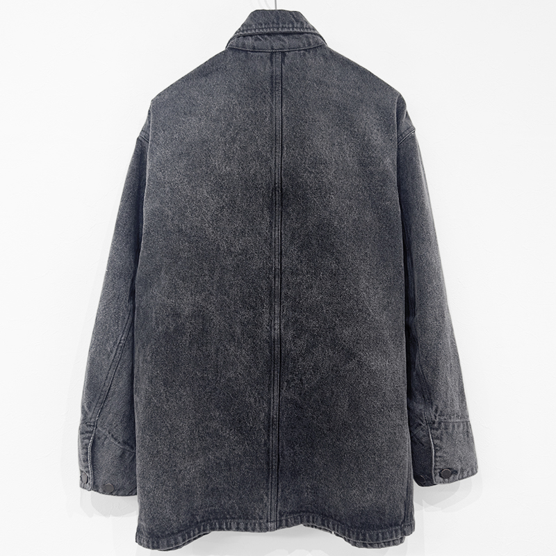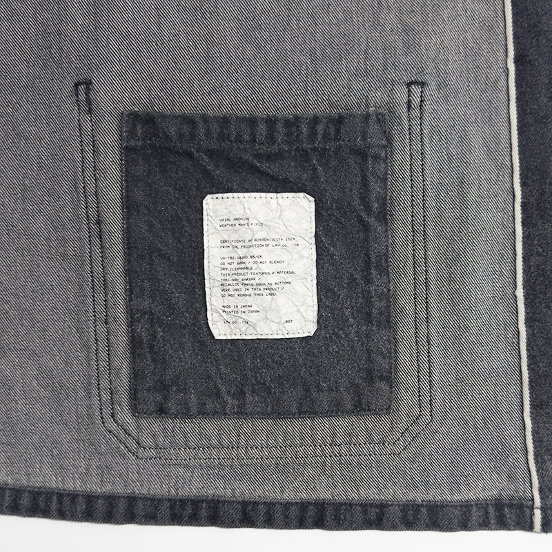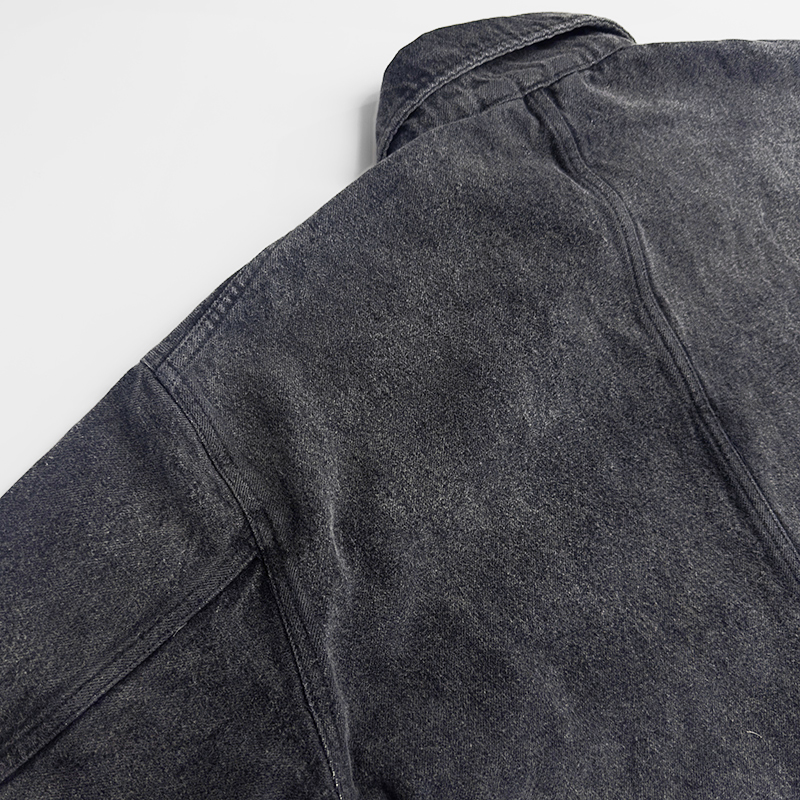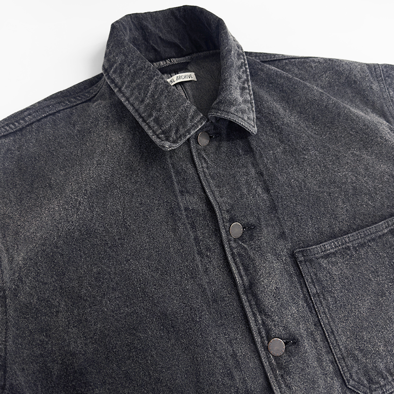 VAINL ARCHIVE(ヴァイナルアーカイブ)のTino BD(VAH25F004)です。デニム生地を使用したカバーオールジャケットです。14ozデニムをベースに、製品後にボールバイオ加工とミストブリーチ加工を施すことで、自然なアタリと奥行きのあるフェード感を表現。ワークウェアらしい無骨な佇まいを残しつつ、柔らかく着慣らしたような風合いに仕上げています。