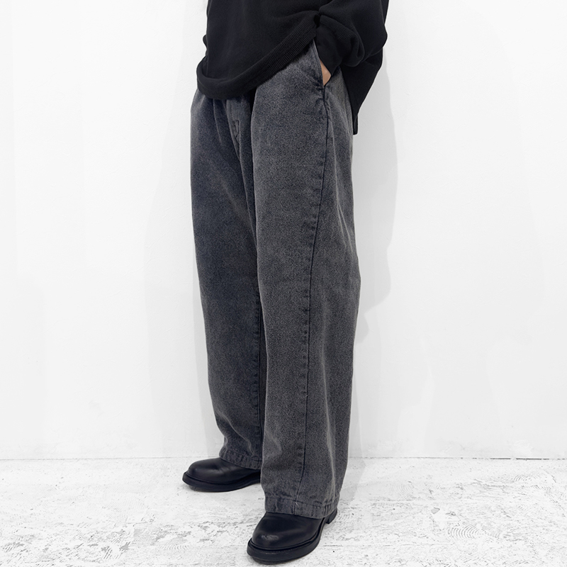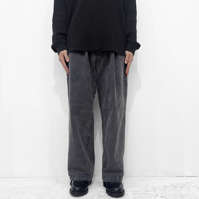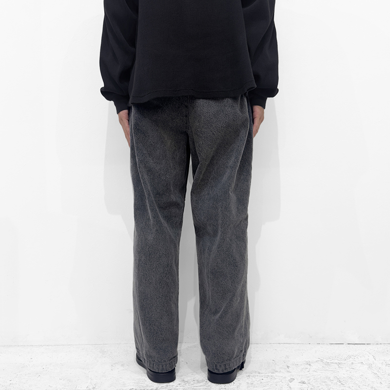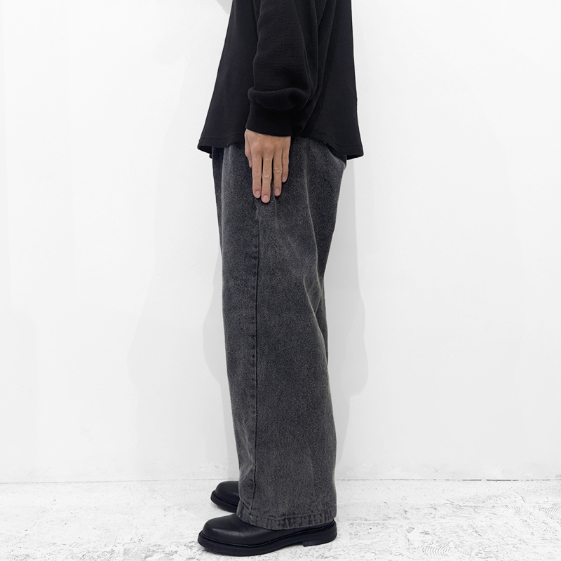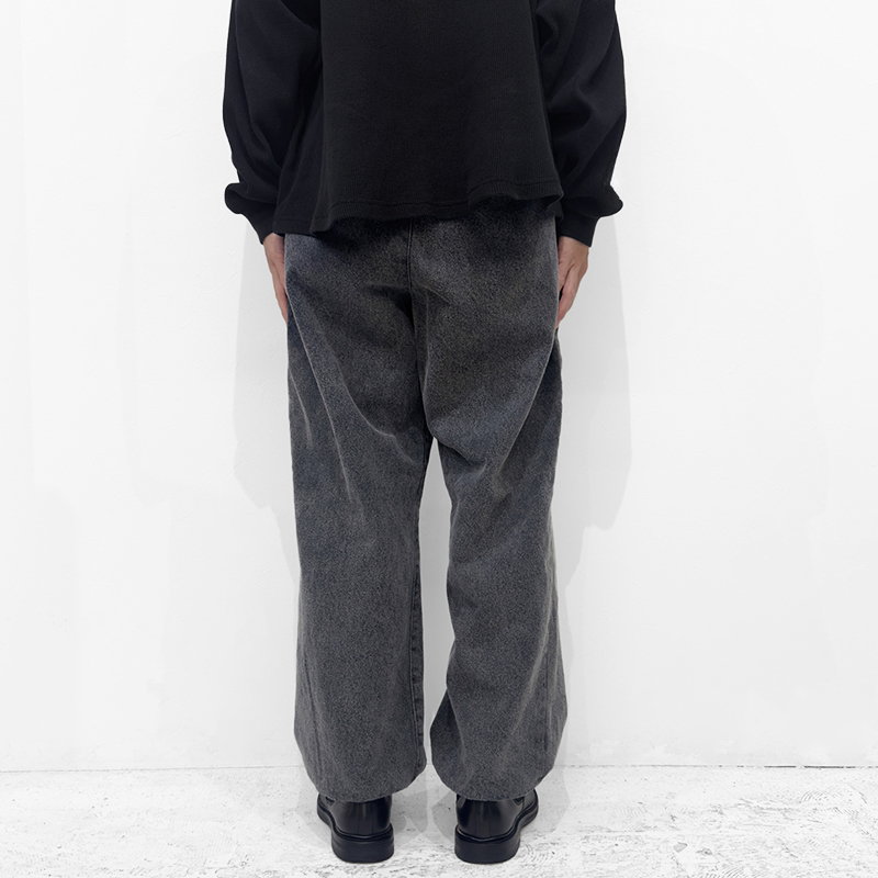 VAINL ARCHIVE(ヴァイナルアーカイブ)のLive-Pants-T(VAH25F005)です。デニム生地を使用したワイドパンツです。14ozデニムをベースに、製品後にボールバイオ加工とミストブリーチ加工を施すことで、自然なアタリや奥行きのあるフェード感を引き出しています。裾にはドローコードを備えており、シルエットの調整が可能です。バックポケットは両玉縁仕様を採用し、デニムでありながらドレッシーな表情をさりげなく取り入れたデザインとなっています。
