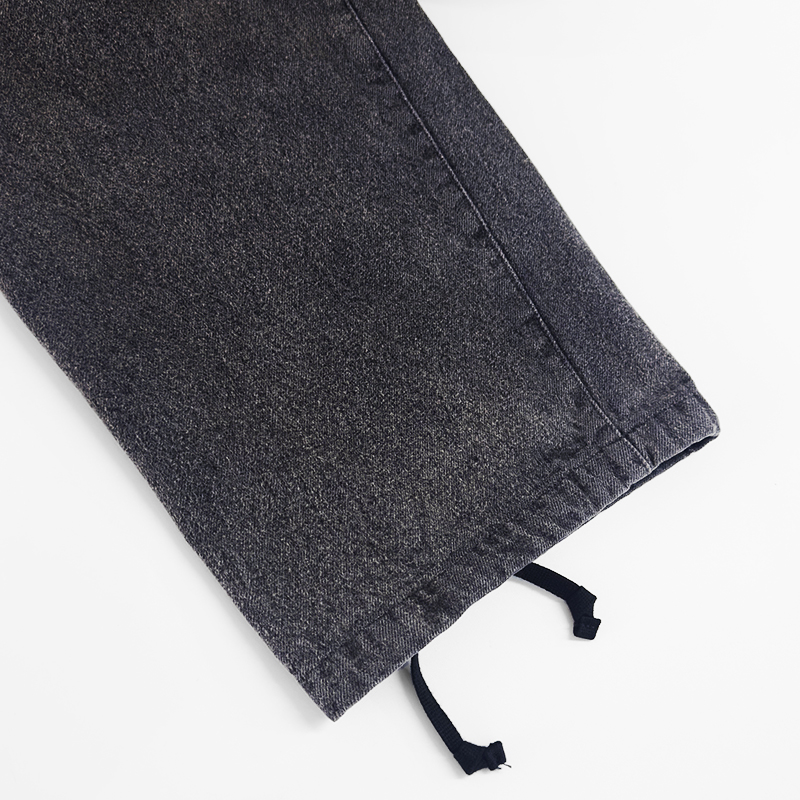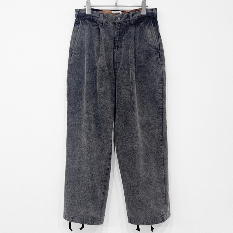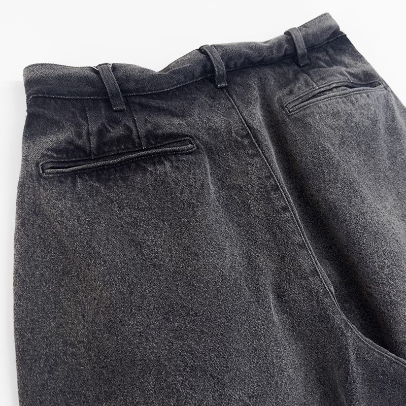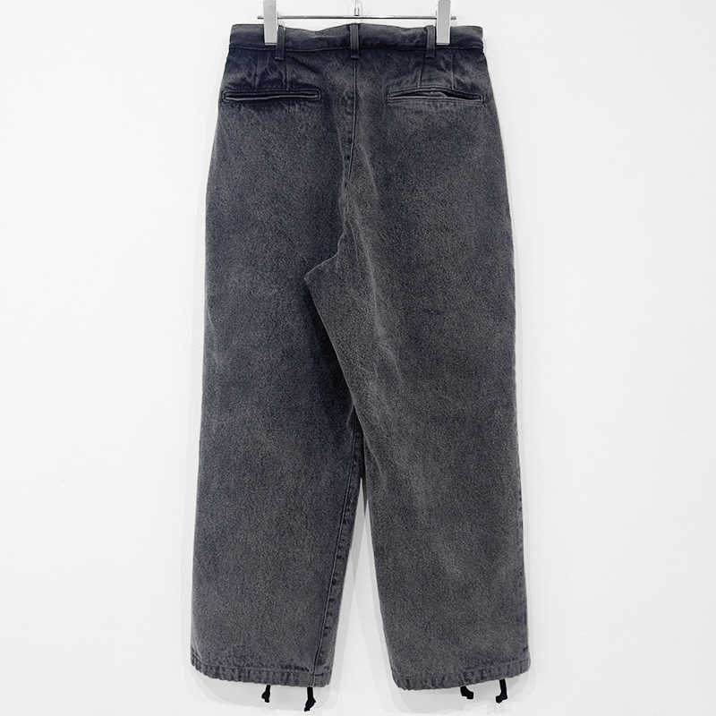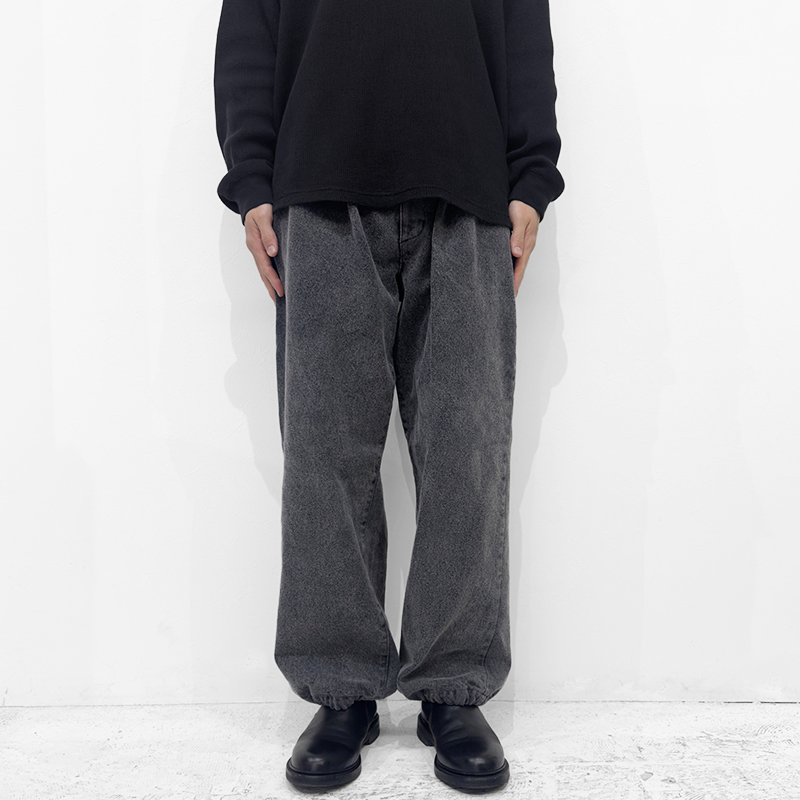 VAINL ARCHIVE(ヴァイナルアーカイブ)のLive-Pants-T(VAH25F005)です。デニム生地を使用したワイドパンツです。14ozデニムをベースに、製品後にボールバイオ加工とミストブリーチ加工を施すことで、自然なアタリや奥行きのあるフェード感を引き出しています。裾にはドローコードを備えており、シルエットの調整が可能です。バックポケットは両玉縁仕様を採用し、デニムでありながらドレッシーな表情をさりげなく取り入れたデザインとなっています。